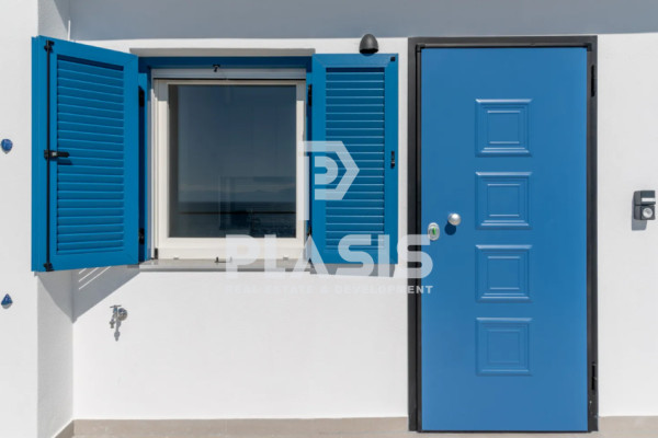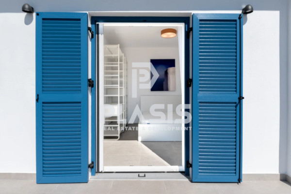 Opening the characteristic blue shutters, the vast blue of the sea is revealed in front of you, shimmering under the sunlight. The white walls, the curved lines of the architecture and the spacious terrace with a panoramic view compose an atmosphere of relaxation and inspiration.