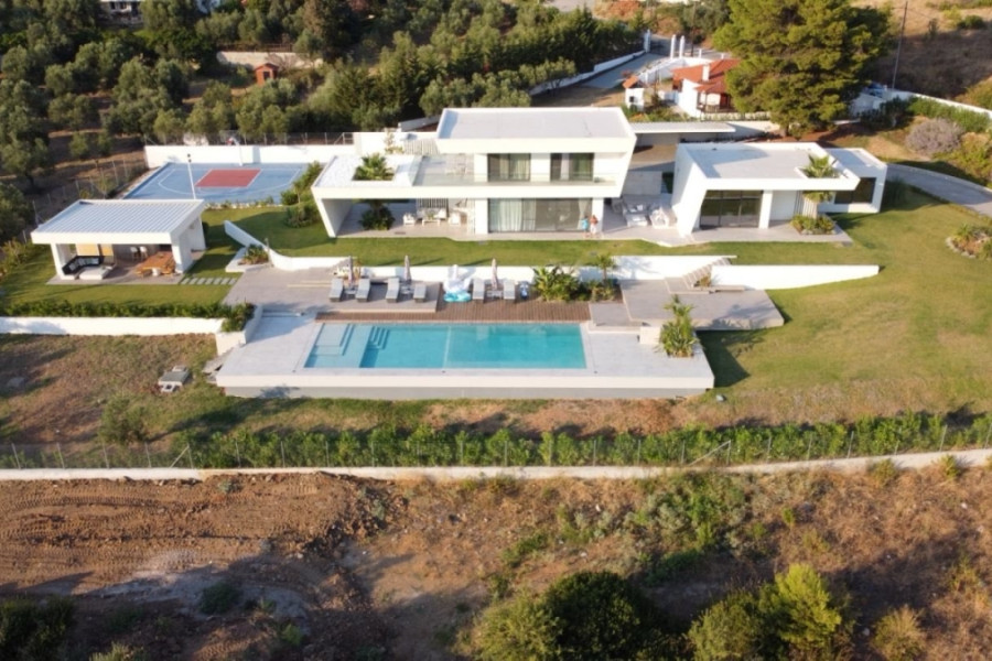 Pallini, Paliouri, Villa For Sale, 480 sq.m., On a plot of 5000 sq.m., Condition: Amazing, Floor: Ground Floor, 2 Level(s), 7 Bedrooms 2 Kitchen(s), 6 Bathroom(s), Heating: Autonomous - Oil, View: Sea, Construction Year: 2020, Energy Certificate: A+, Security Door, Alarm, Storage, Fireplace, Electrical Appliances, Playroom, Internal Staircase, Balconies, Luxurious, Airy, Bright, Air Conditioning, Lawn, Self Watering, Trees, Pool, Garden, Newly Built, Country Home, Orientation: East.