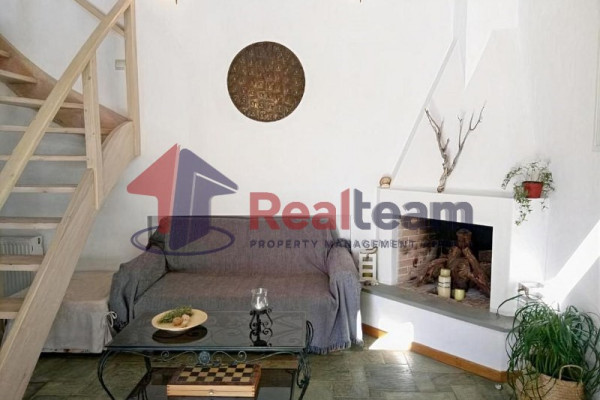 The ground floor, measuring 56.22 sq.m., features a living room with a fireplace, a kitchen, a bedroom, and a bathroom. An internal staircase leads to the upper floor, which has a master bedroom. The house includes double glazing, screens, a 6.85 sq.m. storage room, a BBQ, and a private swimming pool of 15.25 sq.m. The flooring is tiled, the frames are PVC, and it is equipped with an oil heating system, solar water heating system, a/c, awnings, and a fully equipped kitchen with appliances.