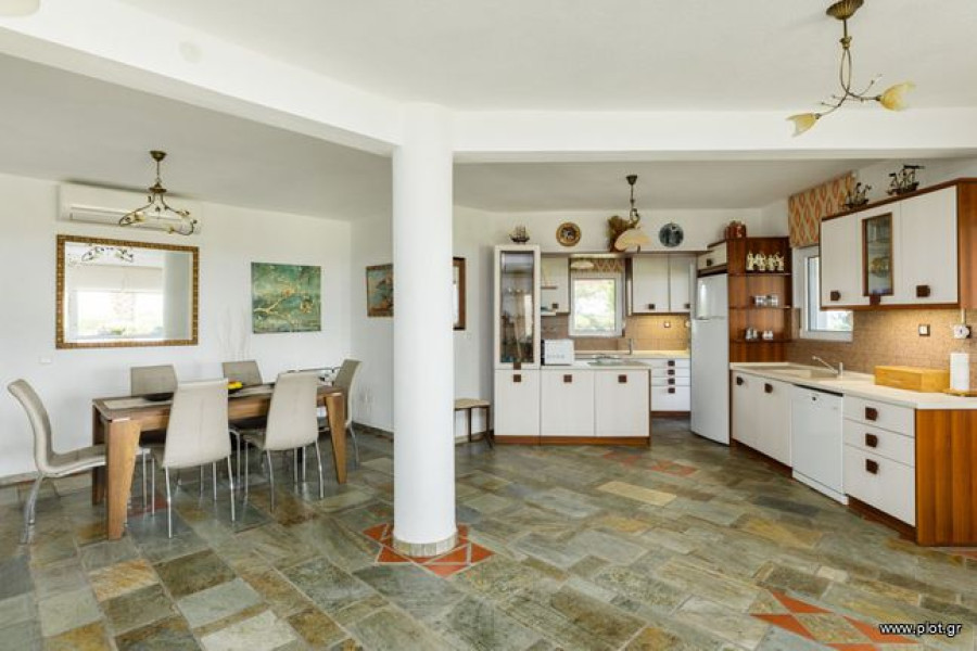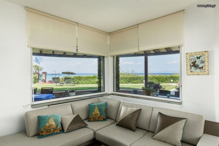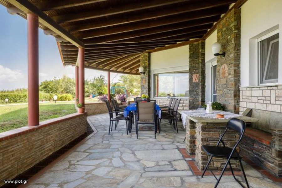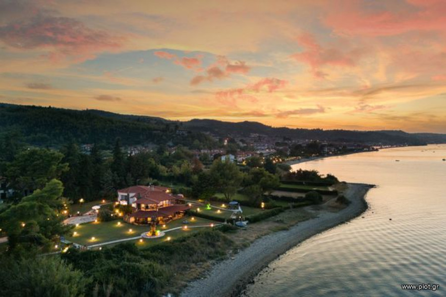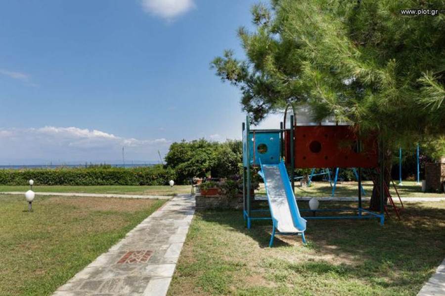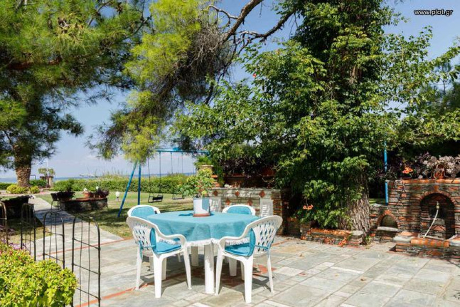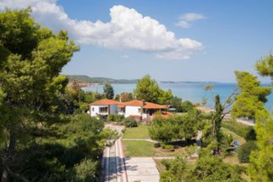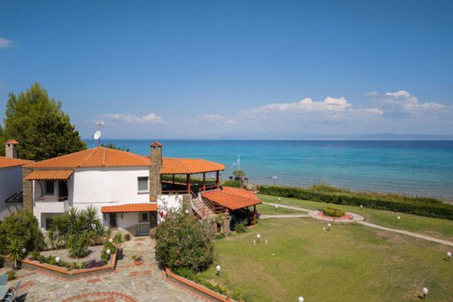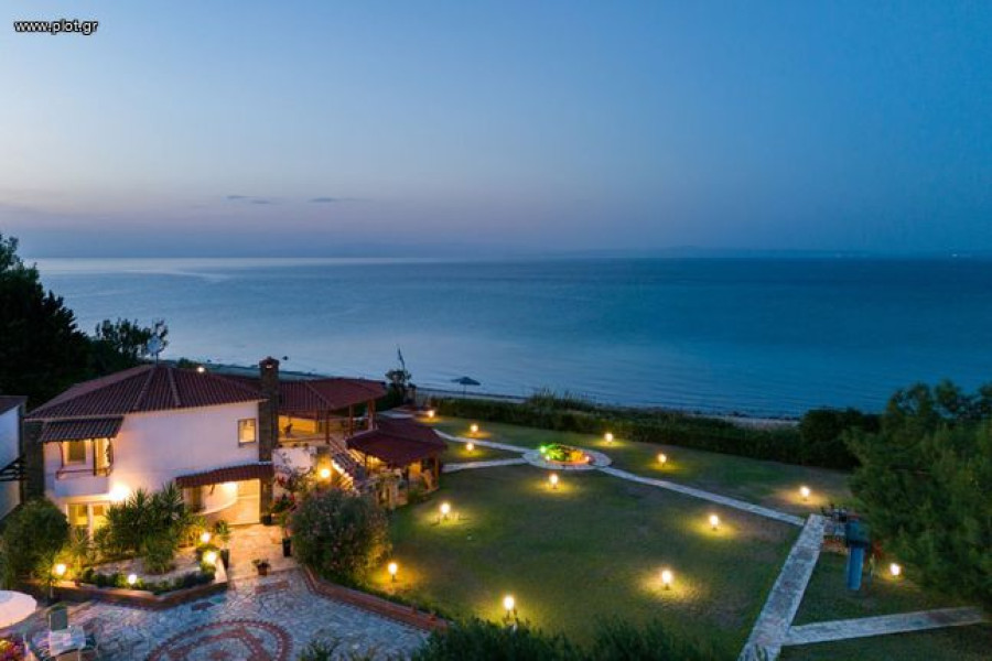 Two fully furnished villas (250m² built in 1995 and 200m² built in 2005) totaling 450m² on a 4,200m² seaside plot in Hanioti, Chalkidiki. Features include 10 bedrooms, 8 bathrooms, 2 equipped kitchens, spacious living areas with fireplaces, landscaped garden, parking, balconies, air conditioning, and sea views. Both villas are sold together as a prime investment property, currently rented for €1,200/day. Price negotiable.