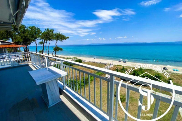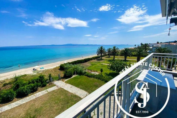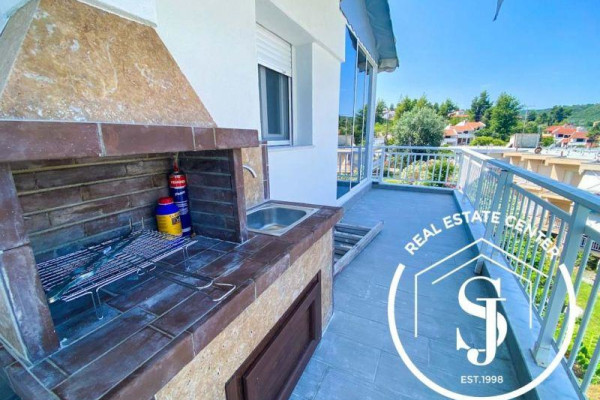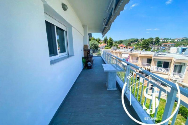 Unique opportunity to own one of two unique penthouses in the elegant building in Chanioti, Halkidiki. The apartment has 360 degree views and sun all day with a terrace that wraps around most of the property. The apartment has 2 large bedrooms and 1 full luxury bathroom. The living room is combined with an open-plan designer kitchen and is surrounded by windows and doors that open onto the terraces, combining indoor and outdoor living. From the main veranda in front of the living room, there is a comfortable sitting and dining area with a barbecue, all with views of Sithonia and views around the penthouse. Equipped with new technology (for example blinds / shutters control, smart home and lights), outdoor living areas, hot/cold air conditioning and a fully equipped kitchen, all within walking distance of the thriving seaside town of Chanioti. The property is sold furnished (except personal effects) and with 1 shaded private parking space.
