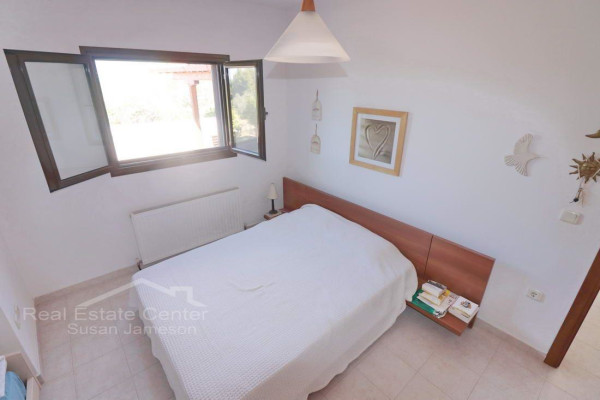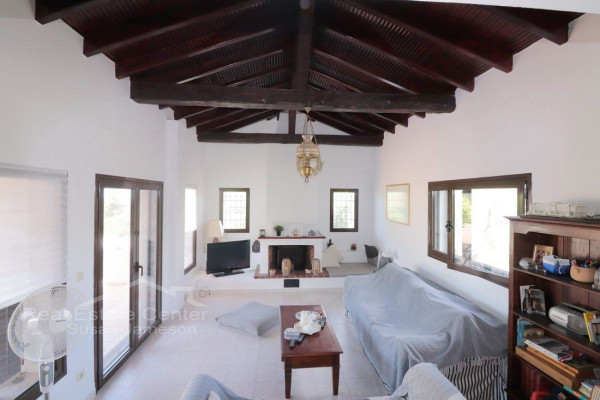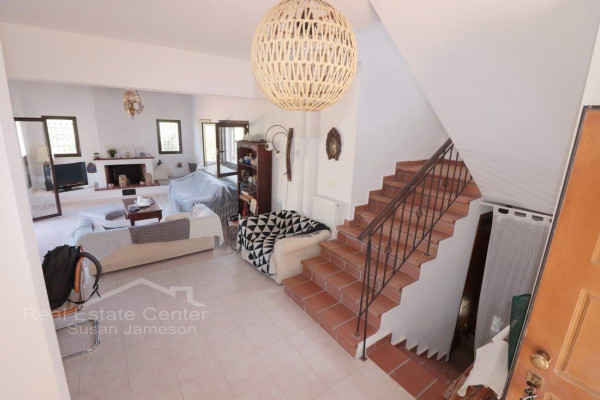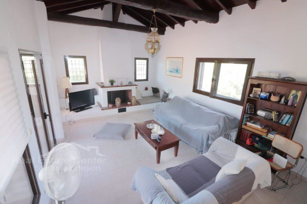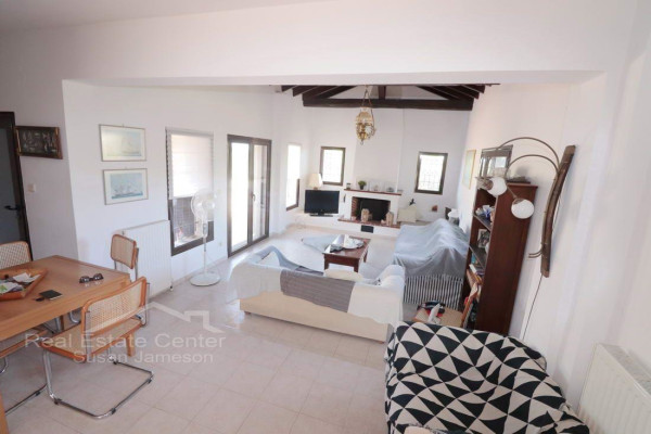 The interior of the house looks much larger than its 147 sq.m., comprising 3 bedrooms, 2 bathrooms, a stylishly designed kitchen and an open-plan living room with high ceilings and wooden beams, creating a warm atmosphere.