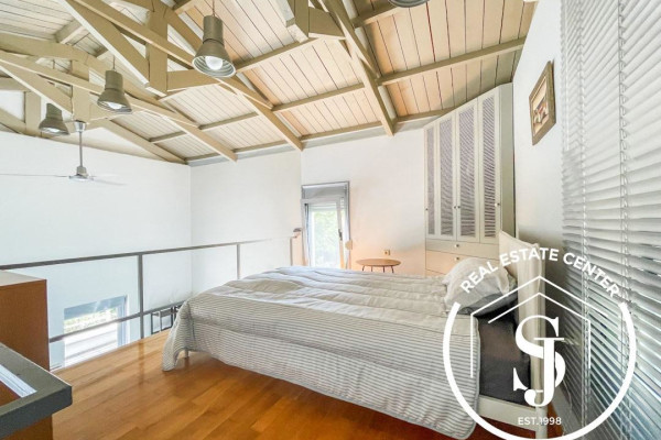 Main bedroom with en-suite bathroom and wardrobe, with exposed wooden beams and high ceiling that exudes a rustic feel. Two additional bedrooms with en-suite bathrooms on the other levels of this beautiful split-level residence!