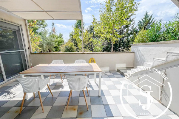 Beautiful, manicured garden with specially landscaped relaxation area starting from the oversized terrace – ideal for **outdoor living and al fresco dining**.