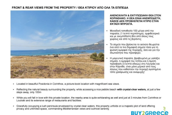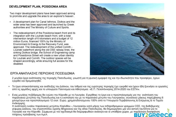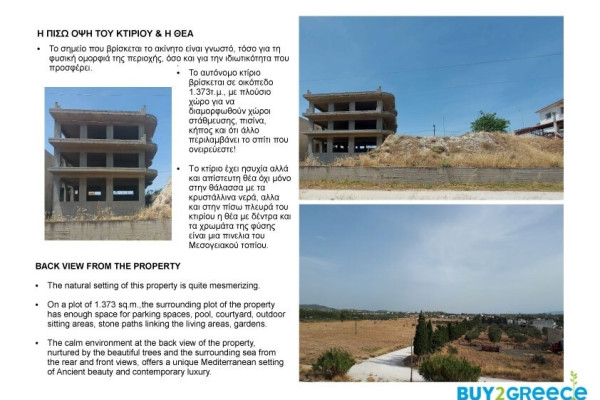 Detached house For sale, floor: Ground floor, 1st, 2nd (3 Levels), in Korinthos - Poseidonia. The Detached house is 705 sq.m. and it is located on a plot of 1.373 sq.m.. It consists of:. The property was built in 1995, the energy certificate is: Not required. The property's status is: Incomplete, 2000 Meters from city, it has Sea view. The Detached house is On Corner, With Facade, Bright, Airy, Luxury, it is suitable for Investment, Garden, Trees. Price: €640,000. Buy2Greece, contact phone: 2107710150, email: