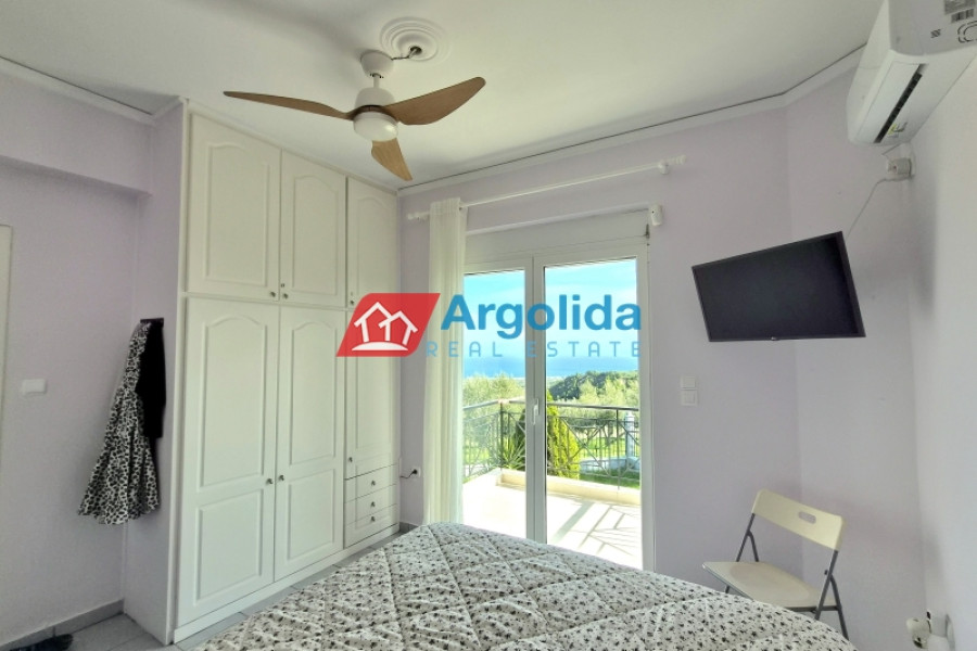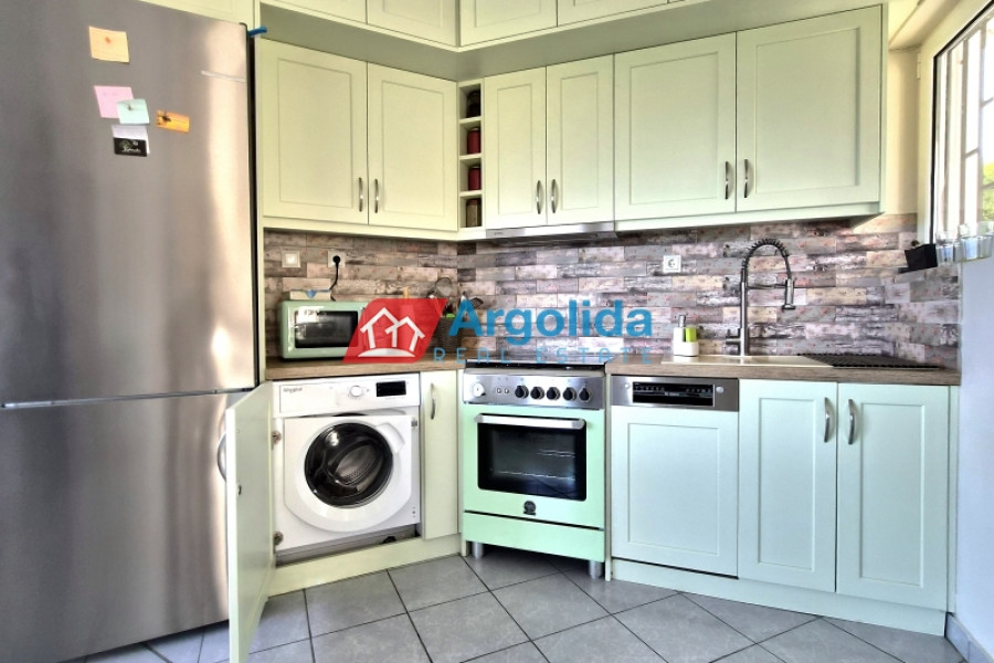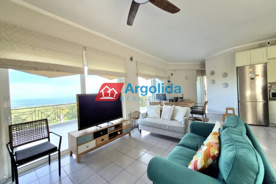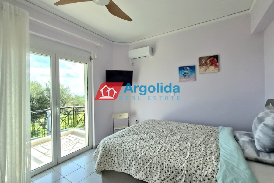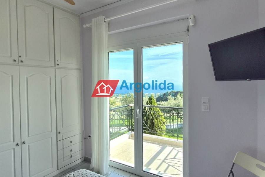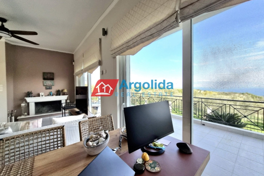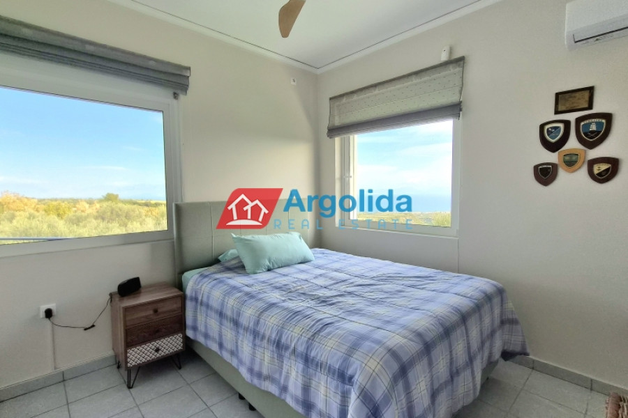 For sale: a single-storey house in excellent condition, built in 1993, located in Lalioti, Corinthia, on a 3,500 sq.m. plot, fully renovated internally in 2024 and offered fully furnished, featuring 3 bedrooms, a living room, kitchen, 1 bathroom and a 55 sq.m. storage area, with handcrafted solid-wood kitchen cabinets, built-in electrical appliances, brand-new beds, living room and outdoor furniture, equipped with solar water heater, air conditioning, ceiling fans, fireplace, aluminum windows with double glazing and screens, electric shutters and awnings, and aluminum security doors. The exterior is beautifully landscaped with Karystos stone, BBQ area, lawn, planting areas, two electric gates and double fencing, while the property includes underfloor oil heating, pre-installation for a heat pump, alarm system with 7 cameras, and full agricultural equipment. The plot features 50 olive trees and various fruit trees, fertile soil for gardening, two 3-ton water tanks supplied by a private borehole, and an automatic irrigation system, along with tools, machinery and a backup generator purchased in 2024–2025. Set in a peaceful, green environment with unobstructed panoramic views of the Corinthian Gulf, it is just 10 minutes from the beach and 20 minutes from Kiato, close to mountain destinations such as Lake Stymphalia and Trikala Corinthias, and near several renowned wineries, making it ideal for those seeking relaxation, privacy and a nature-oriented lifestyle.