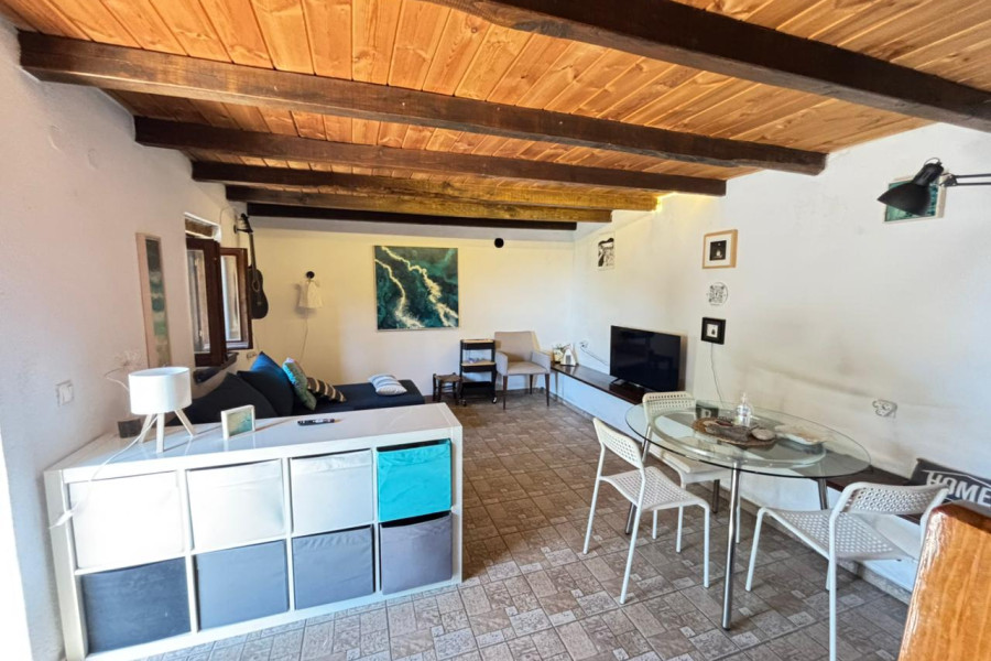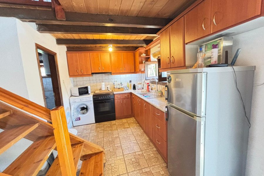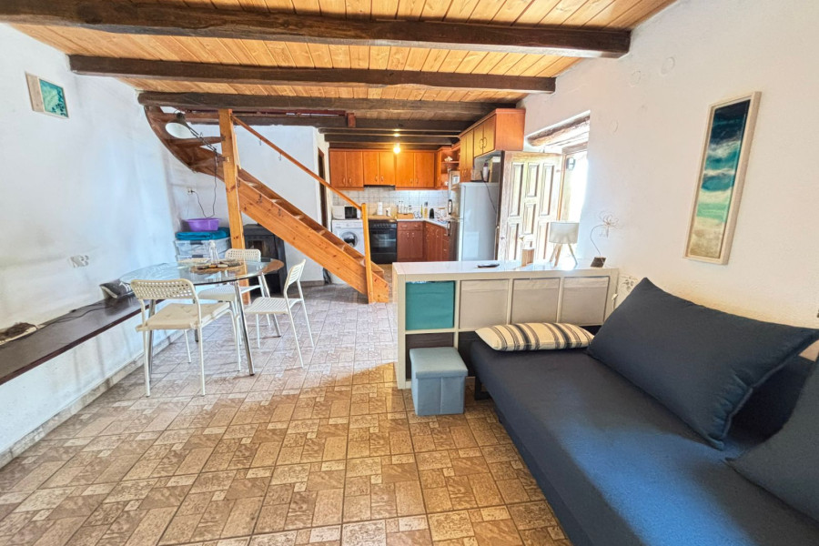 The ground floor features a comfortable open-plan living room and kitchen, as well as a fully renovated bathroom. The upper floor is a spacious open-plan area that can easily be divided into two separate bedrooms, depending on your needs.