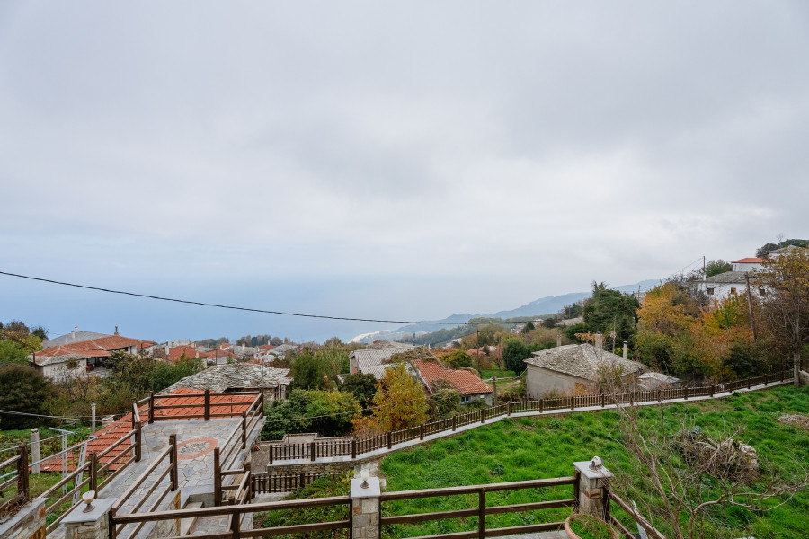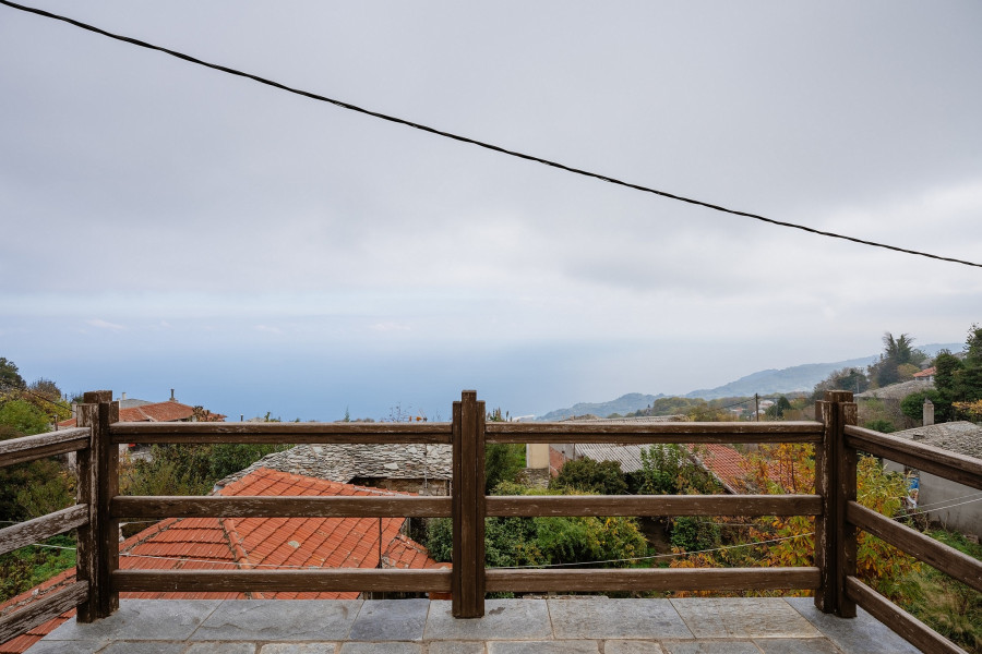 On the 1st floor, there are 2 bedrooms with fireplaces, 1 bathroom, and a bright living room that leads to a balcony with panoramic views of the Aegean.