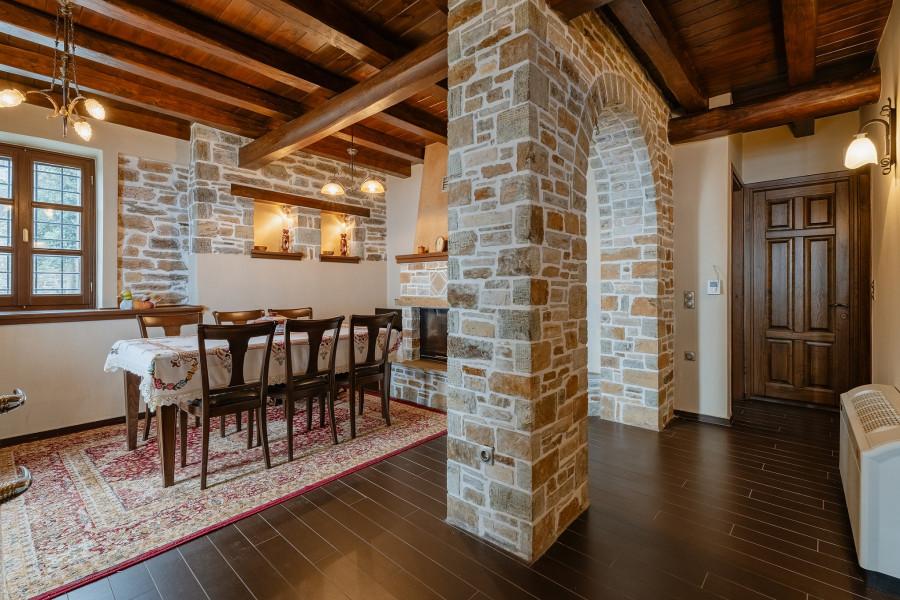 Outdoors, the traditional stone oven with an adjacent storage room stands out, along with 2 additional storage spaces totaling 35 sq.m., as well as a designated parking area for 2 cars.
