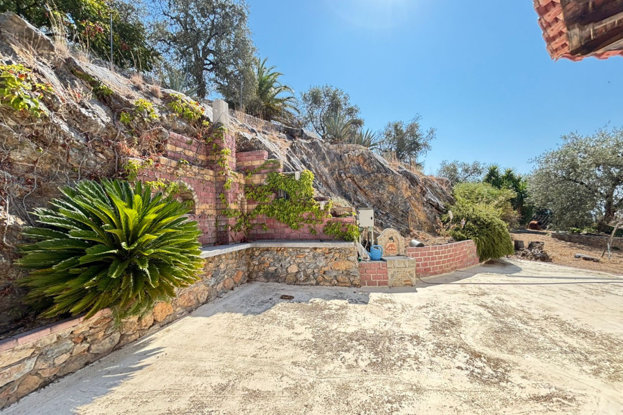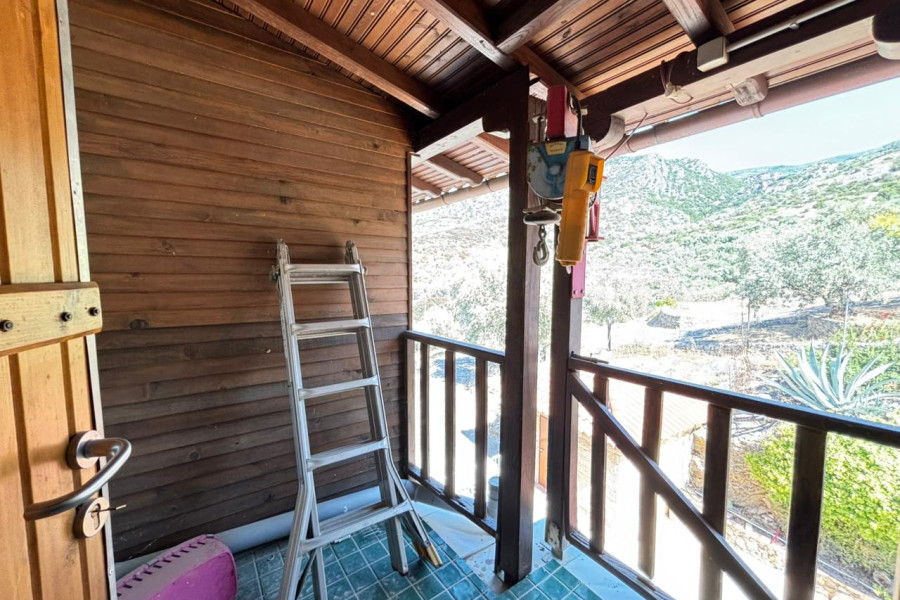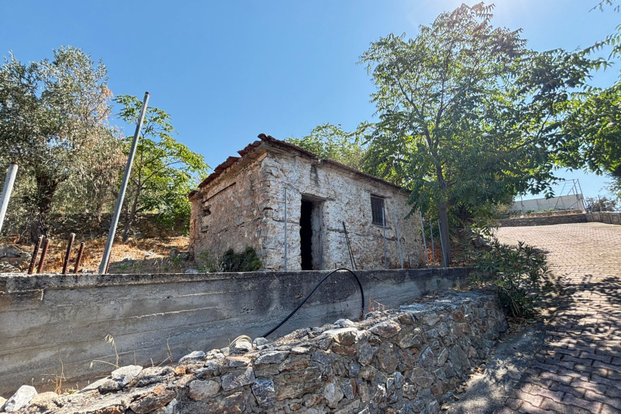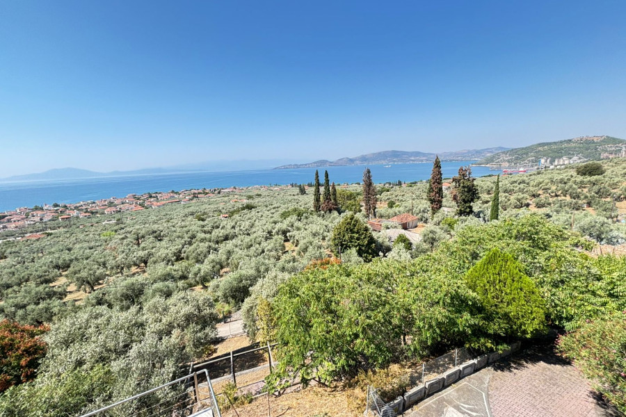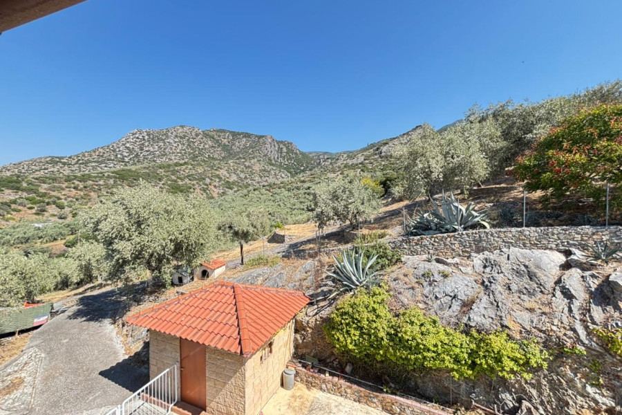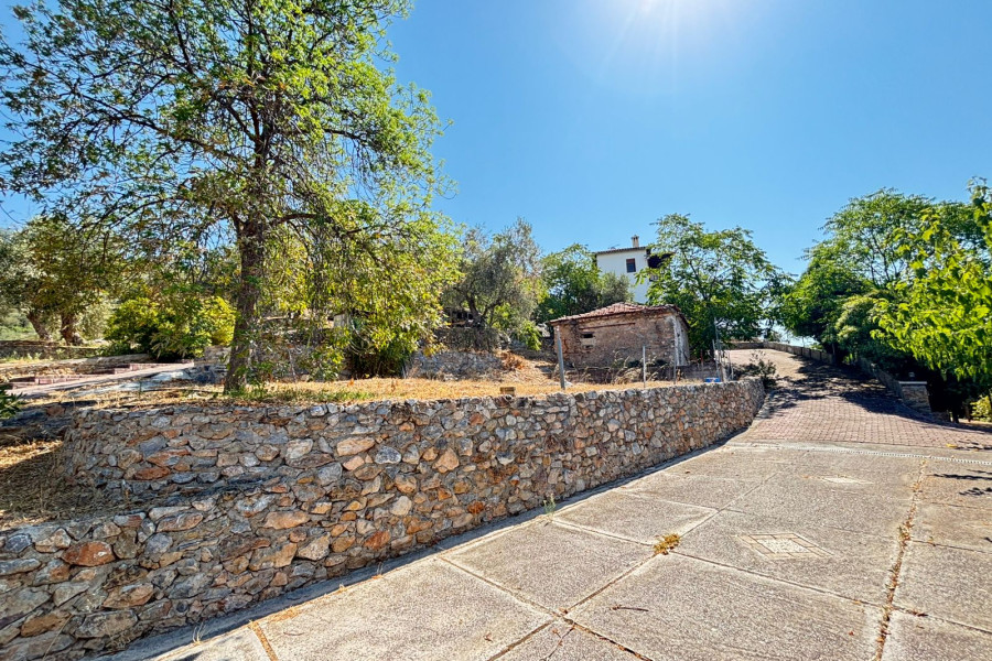 The property is situated on a landscaped plot with paved areas, stone walls, olive trees, and parking space. It offers a unique view and is easily accessible via an asphalt road.