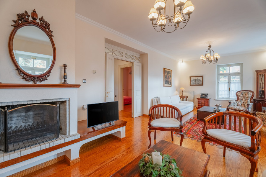 The 1st floor, where the main entrance of the residence is located, features an elegant living room with neoclassical touches, 1 bedroom and 1 bathroom, creating a refined and comfortable daily living space.