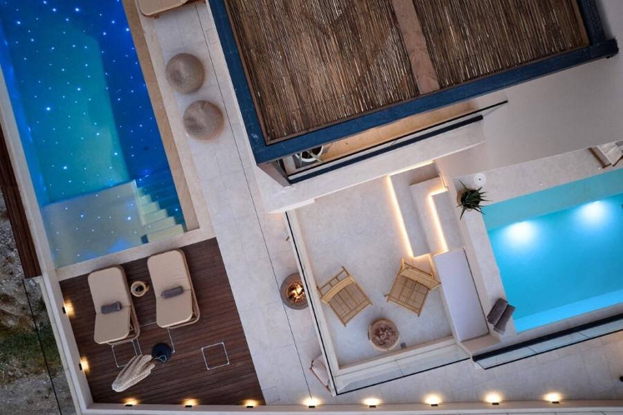 Equipped with sunbeds, pool poufs, and an outdoor living space that includes a comfortable sofa, two armchairs, and a gas fireplace, the pool area is perfect for relaxation and enjoying magical summer nights. The pool features a water control system to maintain the ideal temperature year-round.