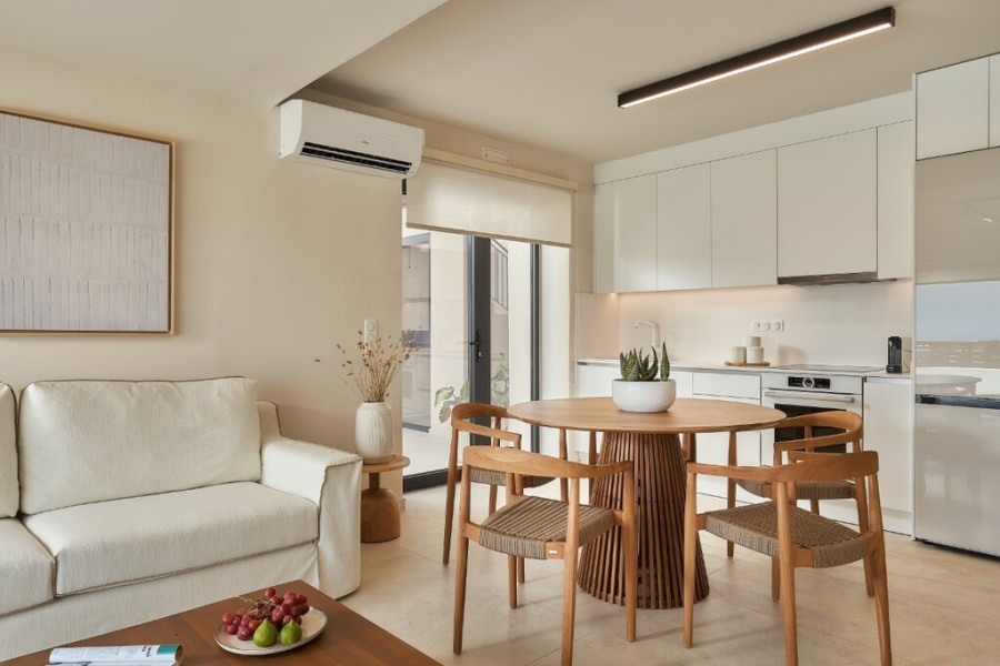 - A spacious living room with an open-plan kitchen and direct access to the main pool.
