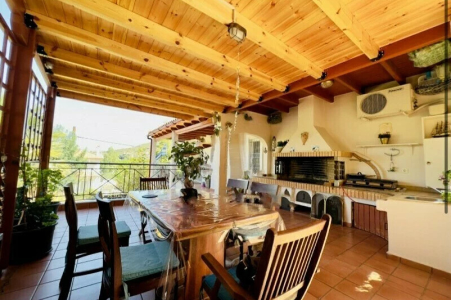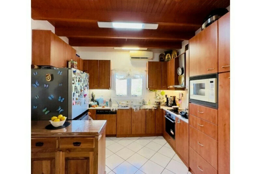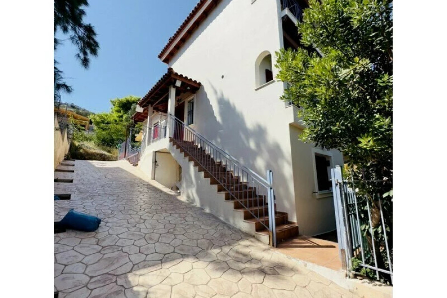 ATE area of Palaia Fokaia, the main house is 200 sq.m. with an additional 55 sq.m. storage space and parking, 150 sq.m. beautiful landscaped garden, with perimeter terraces of 150 sq.m. plus 60 sq.m. pergolas with bbq, energy pellet 15.1 kw, the house has two entrances, it is joined by a staircase but there is also the possibility of separation into two independent houses, ground floor 70 sq.m. overlooking the garden, with an additional warehouse of 24 sq.m. and 31 sq.m. parking with electric garage doors, includes bedroom, large living room, kitchen and bathroom. The first floor is 106 sq.m. with very good views, with 2 bedrooms - living room, patio, kitchen and bathroom. The second floor has a room of 24 sq.m. with an unlimited view, there is underfloor heating and a radiator with a burner, biological wastewater treatment and an additional 15.1 kw pellet fireplace.