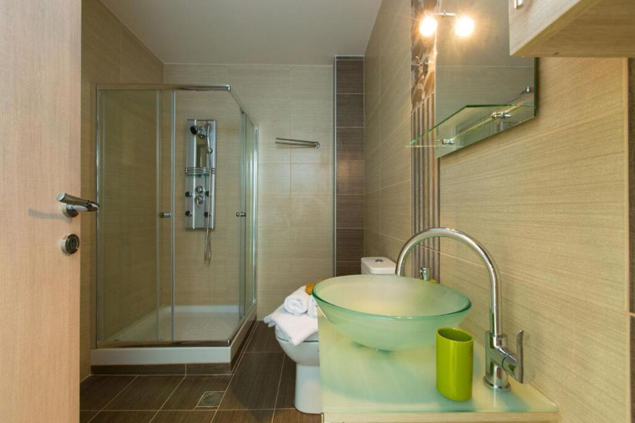 The attic features a spacious bedroom with its own bathroom and access to two balconies. The larger balcony is equipped with infrastructure for a jacuzzi and provides breathtaking views of the sea, mountains, and olive groves.
