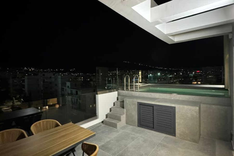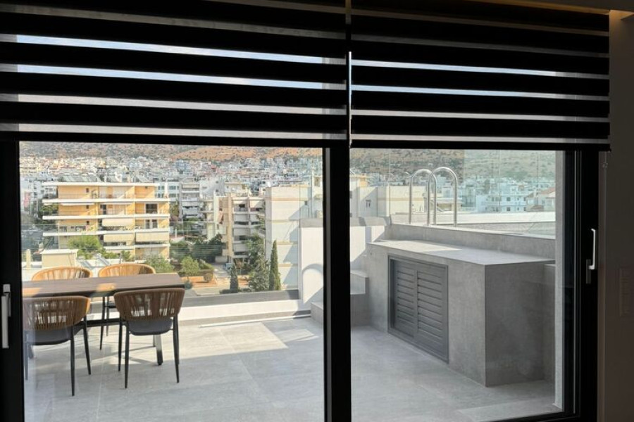 For sale duplex of 130 sq.meters in Athens. The duplex is situated on 5. etage and 6. etage. 5. Etage consists of 3 bedrooms, 2 bathrooms. 6. Etage consists of living room with kitchen, one shower WC, one office. A magnificent view of the city, the sea, the mountain opens up from the windows. There are: solar panels for water heating, a fireplace, air conditioning, awnings, heating, a barbecue area. The owners will be leaving the furniture with the sale. Building has an elevator. There is an alarm system installed. Extras included with the property: parking space, garage. The property boasts a swimming pool of private use.