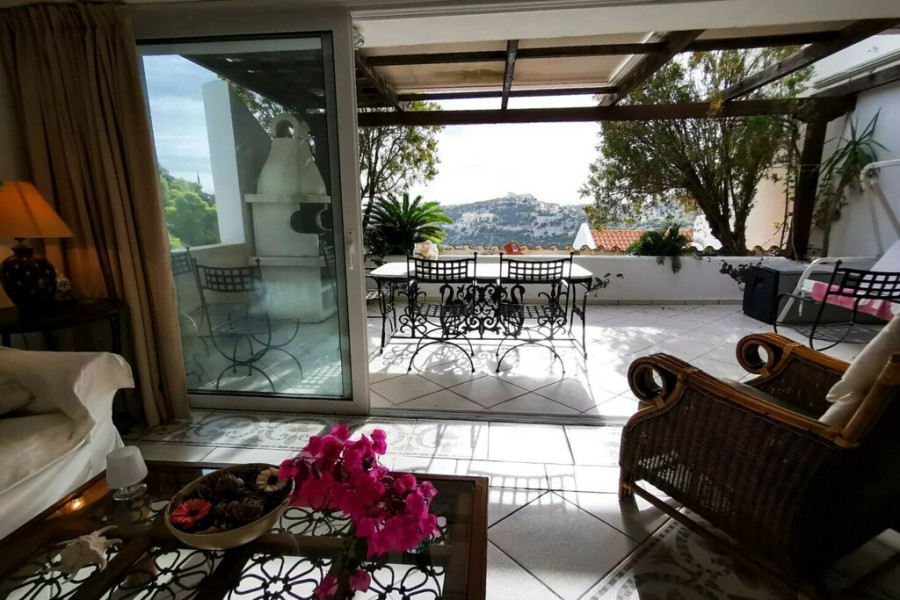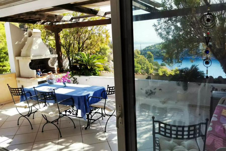 For sale maisonette of 91 sq.meters in Peloponnese. The maisonette has 2 levels. Erdgeschoss consists of living room with kitchen, one WC. 1. Etage consists of 2 bedrooms, one shower WC. A magnificent view of the sea, the forest opens up from the windows. There are: air conditioning, awnings, heating, a barbecue area. Extras included with the property: garden. The property boasts a shared swimming pool.