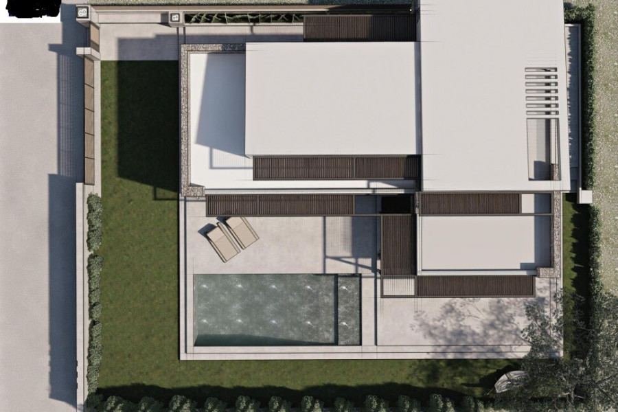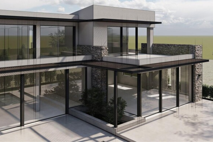Spacious living room with panoramic windows and access to the terraceOpen-plan kitchen and dining areaPreparation for fireplace installationDirect access to the heated pool and relaxation areas with pergolasFirst Floor: