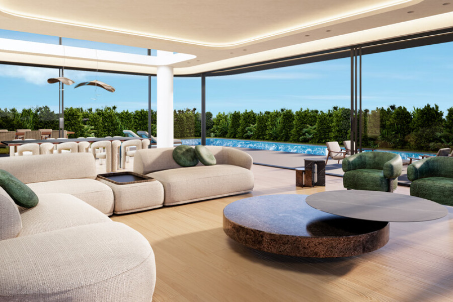 Ground Floor – 171 sq.m. The ground level welcomes you into a bright and spacious open-plan living area with oversized floor-to-ceiling glass doors that open to the garden and pool. The double-height ceiling in the living room creates an extraordinary sense of space and light.