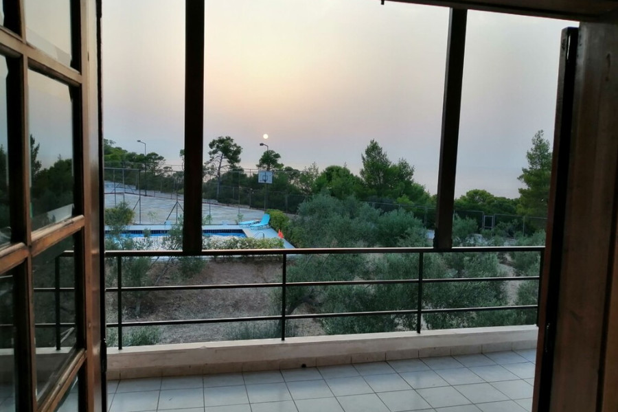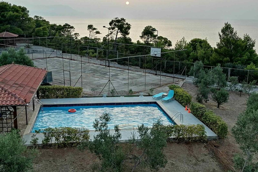 The ground floor (125 sqm) has its own, private entrance and includes a large living room, gym, kitchen, bathroom and two bedrooms. As on the first floor (125 sqm), the first bedroom has a king-size bed and the second has three single beds. All beds are built in permanent position. Large verandas are on all four sides of the first floor which apart from the living room, kitchen, bathroom and two bedrooms, there is an internal staircase leading to the attic (90 sqm), which includes a king size bedroom with desk and sitting area,. Next to it there is a living room with a view and a bathroom. Recently the property has been renovated on several levels. The house is located between an olive grove on a plot of 8. 5 acres with fencing and is guarded by a security system. In the pool area there is a roofed patio. The swimming pool (60sqm) is filled from a borehole, while the property has water tanks, watering system and fire extinguishing system. Next to the pool there is a fenced tennis court. On the plot there is another patio and a storage room of 20 sqm. The property is located in a forest in an environment of absolute peace, tranquility and security. It is 125km from the airport, 100km from Athens and within walking distance from archaeological and famous tourist destinations. It also has its own tennis court.