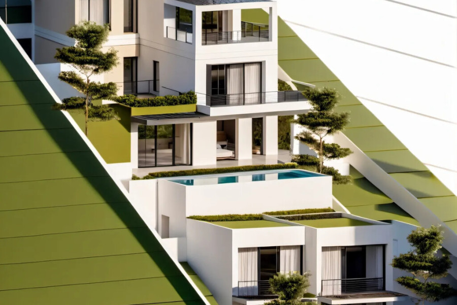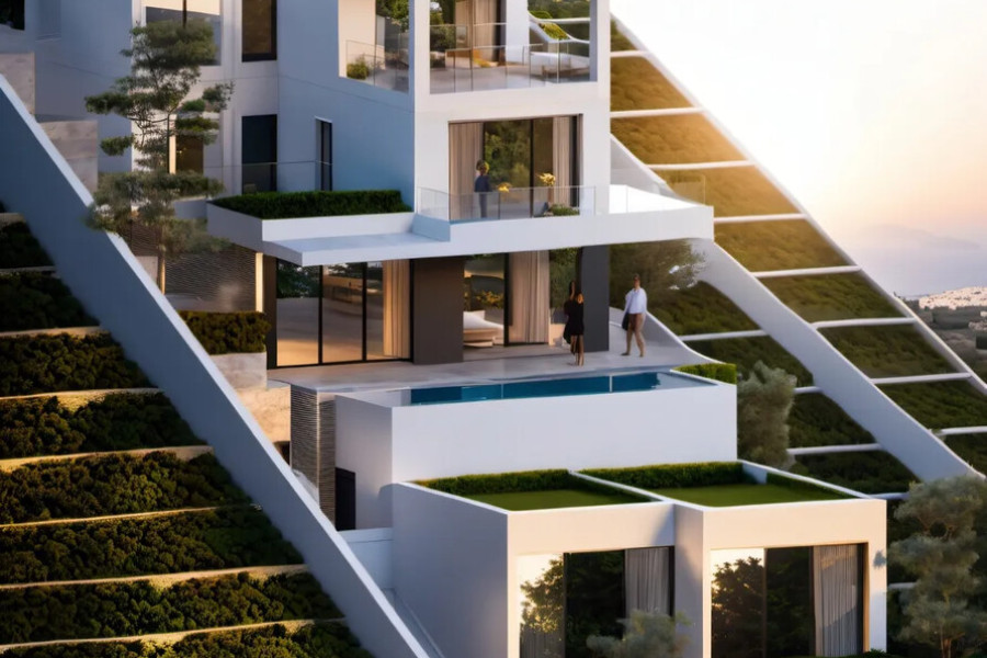 Main residence 312 m² with swimming poolTwo guesthouses 47 m² each, with independent access from the lower levelUnderground garage + 2 car portsTwo design options for the main villa: