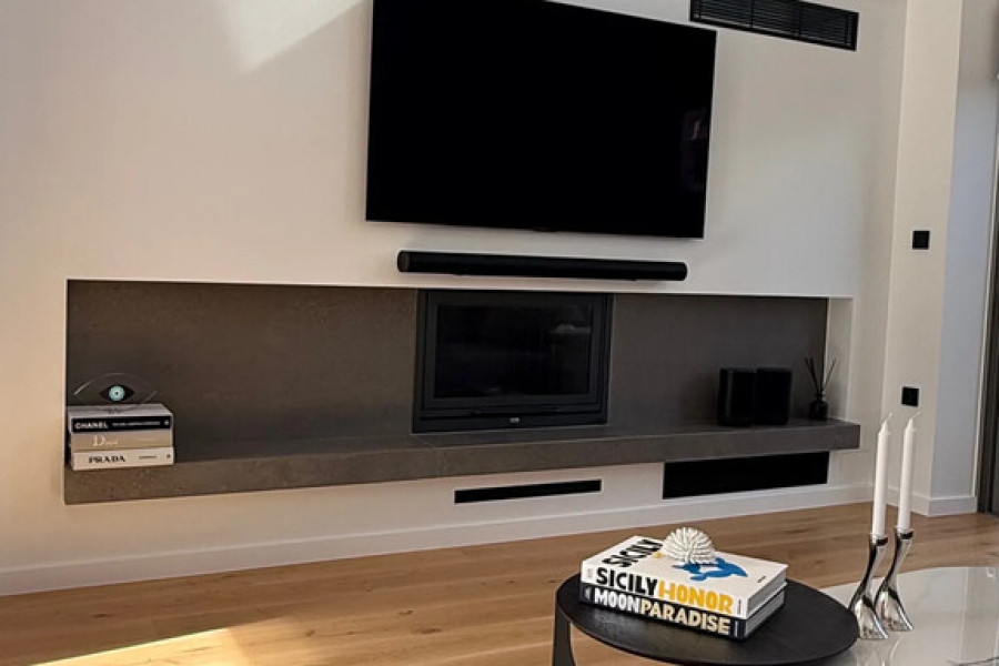 Ground FloorThe ground level welcomes you with a stunning open-plan living and dining area, enriched by natural light, elegant lighting design and warm wooden accents. The energy fireplace creates a cozy atmosphere, while large glass openings provide direct access to the landscaped garden.