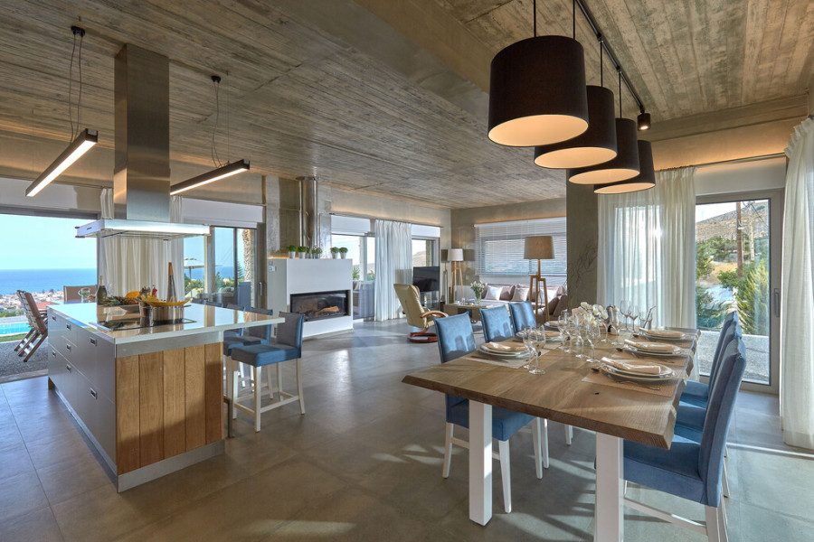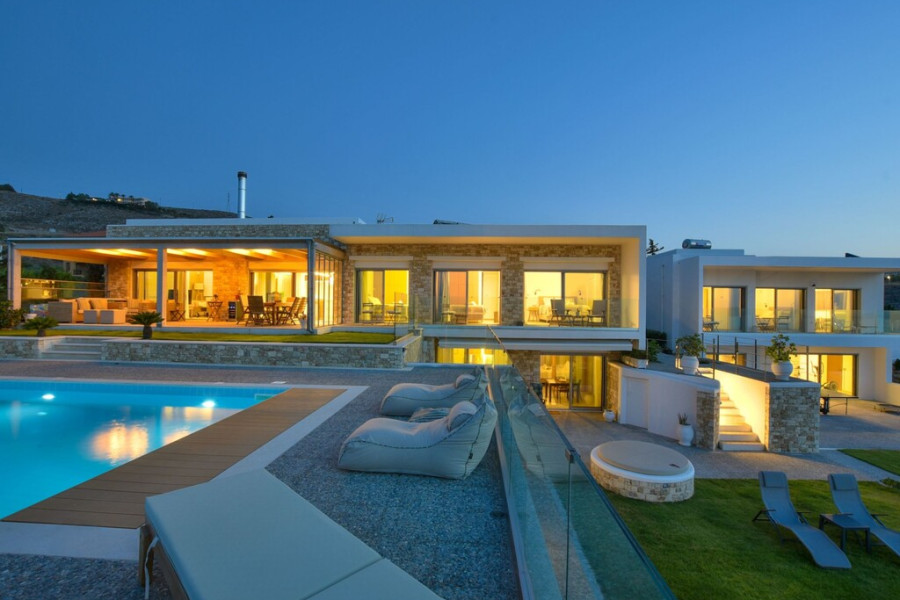 Set in Heraklion, Crete, this masterfully designed 450 m² villa, built in 2016 and completed in 2018, lies within an expansive 11,500 m² private estate. It offers uninterrupted panoramic views of the sea, mountains, city, and Zeus Island.