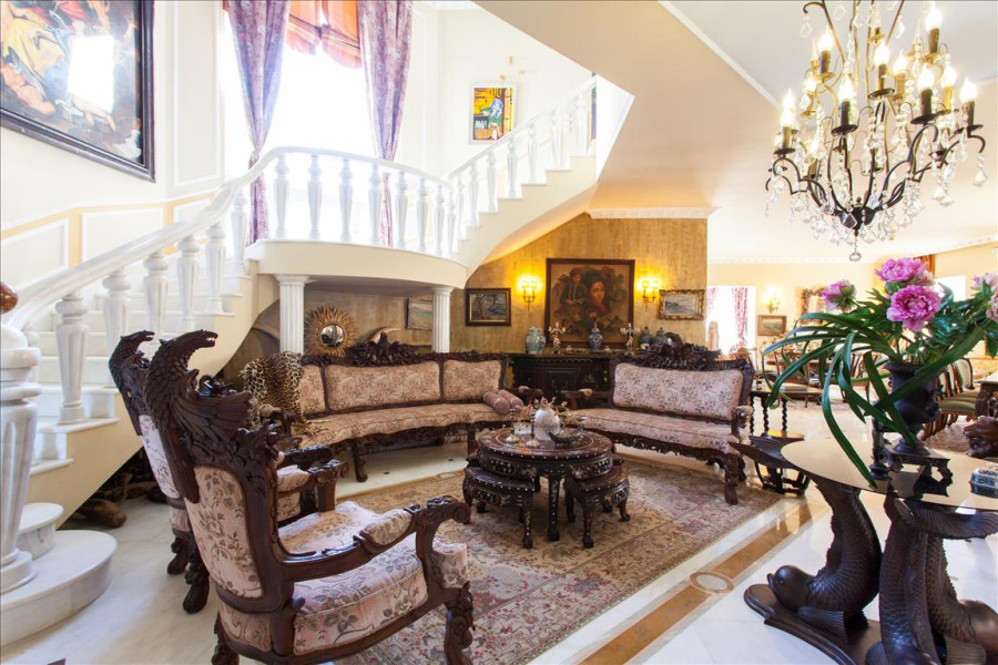 The villa features a spacious veranda with marble balustrades and columns that exude grandeur. The garden, rich with deciduous trees and palm trees, provides a private retreat amidst nature. The pool, perfect for relaxation, complements the outdoor environment with its clear water reflecting the blue sky. The interior spaces are equally impressive, with selected materials and modern amenities ensuring comfort and style.