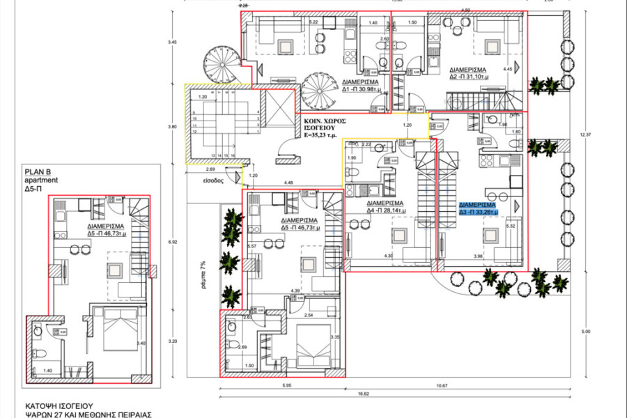 Kastraki Park: 600m (9 minutes walk)Central Port of Piraeus: 600m (9 minutes walk)General Building Information:Total Area: 2361 sq.m.Plot Area: 424 sq.m.Number of Floors: 11Year of Construction: 2003Current Status: Under renovation to create luxury apartmentsInfrastructure:Second Basement: 9 parking spaces (153 sq.m.) – Each parking space is sold separately at a price of 20,000 €. (2 parking spaces reserved)First Basement: 10 parking spaces and storage areas (458.88 sq.m.) – Each parking space is sold separately at a price of 20,000 €. (2 parking spaces reserved)See all available properties in the building [Here].