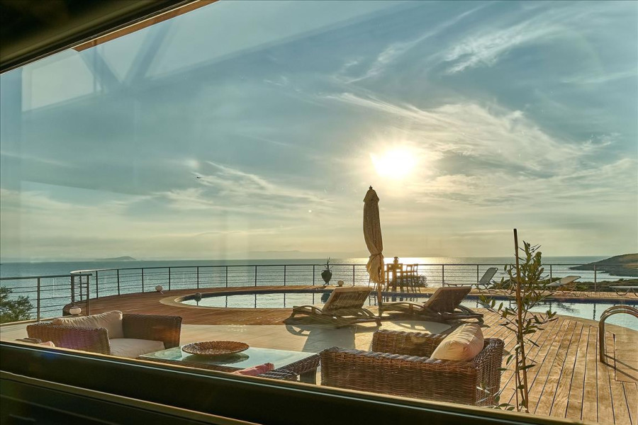 Hall with office and librarySmall kitchenette2 bedrooms:70 m² master bedroom with king-size bed, private gym, small living area and enormous 50 m² en-suite bathroom with Jacuzzi for 3 people, shower cabin and panoramic sea views. Direct access to a furnished veranda with breathtaking sunset views.Bedroom with 2 single beds and en-suite bathroom with showerOutdoor Spaces900 m² landscaped area in front of the villaPrivate 140 m² swimming poolBBQ area with dining tableSunbeds, sofas and lounge areasParking space for carsA villa that perfectly combines luxury, privacy and stunning seafront views — ideal as a permanent residence or as a high-end investment.