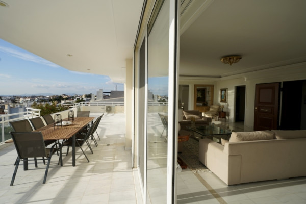 In Ano Voula, a luxurious floor apartment on the third floor is available for sale. It stands out for its unique architecture and complete furnishing and equipment. Spread over 300 m², it offers 4 bedrooms (including a master bedroom) and large reception areas adorned with marble, which enhance the aesthetic of the space while providing a stunning sea view.