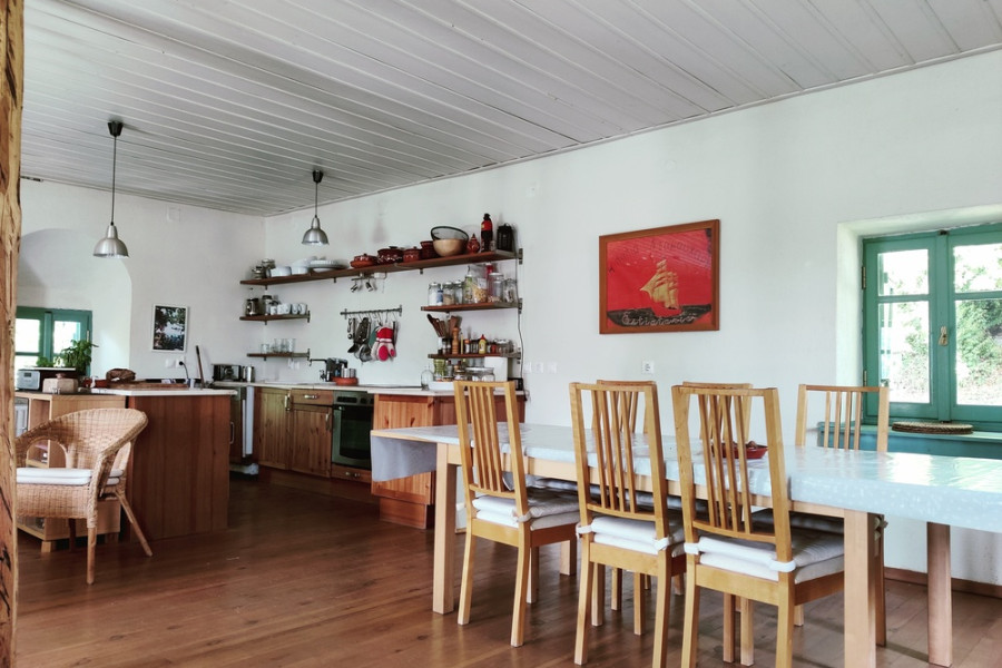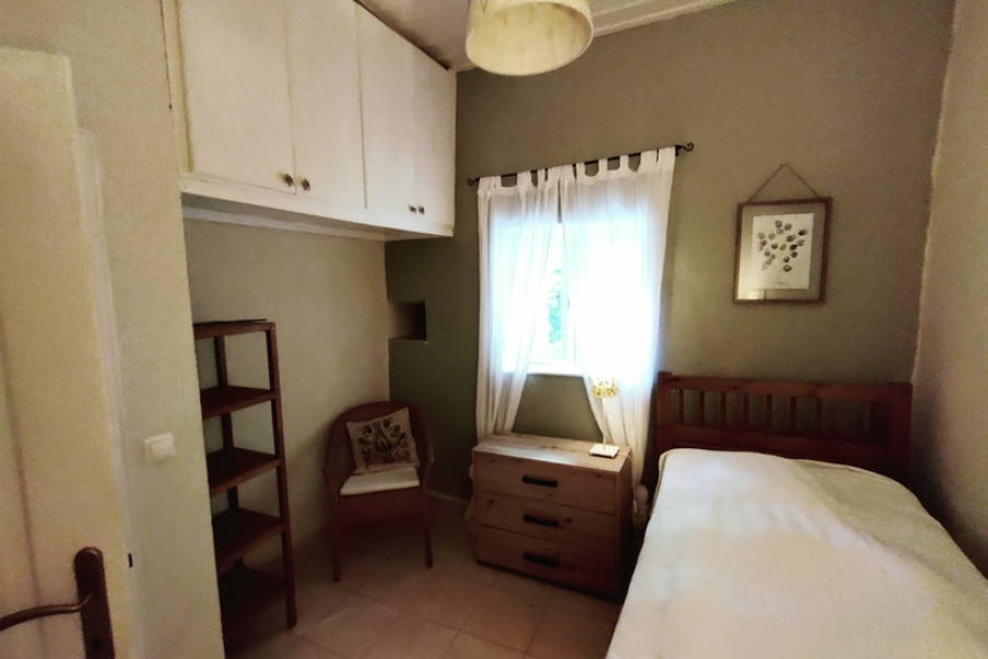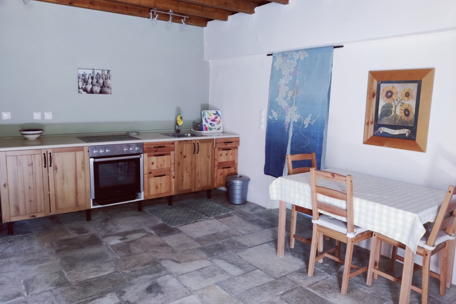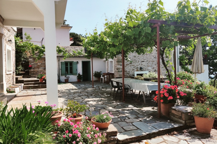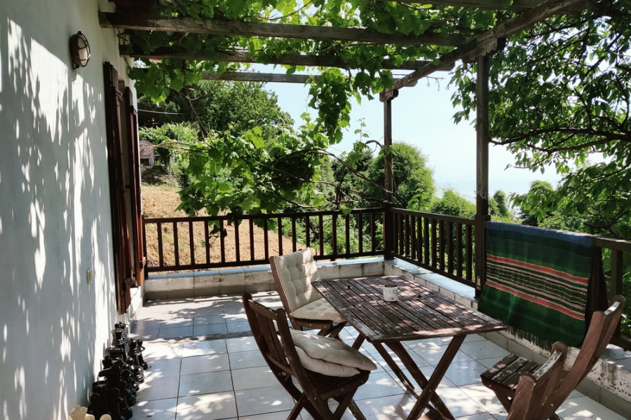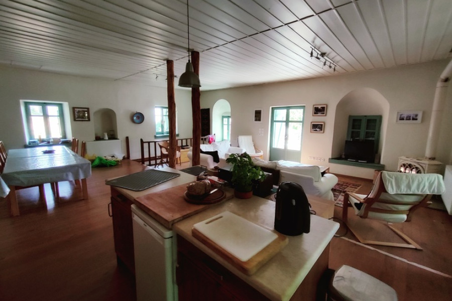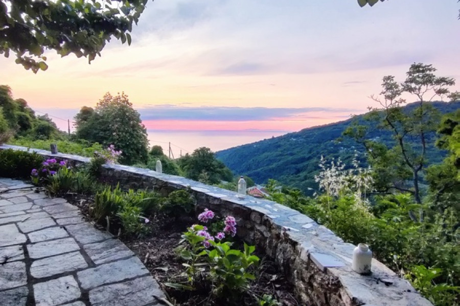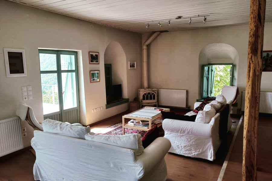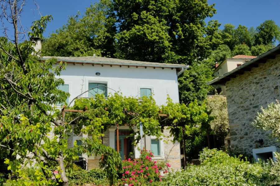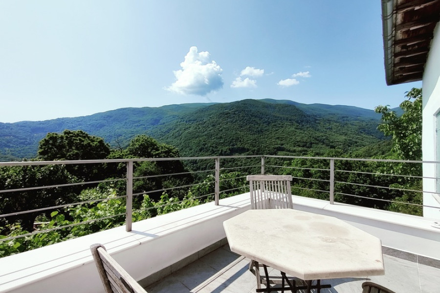 Detached house of 156 sqm with additional guest house 58 sqm with view, on a plot of 2400 sqm for sale in Kissos, Pelion. The property consists of two levels. Entering the ground floor, we find 3 bedrooms and two bathrooms. An internal staircase leads to the upper floor, which consists of a large open space with a living room and kitchen. From the balconies on the upper floor, the property offers amazing sea and mountain views. On the plot, there is also a guest house 58 sqm, which consists of two levels. The ground floor includes a bedroom, a bathroom, and an open-plan kitchen-living room. An internal staircase leads to mezzanine level where there is a bedroom and a large balcony. Next to the guest house, there is a smaller building that houses the heating system and serves as a storage space.The garden of the property is 2400 sqm, offers stunning views from various points, is laid out on different levels, and has many fruit trees. The property is ideal for Golden Visa.