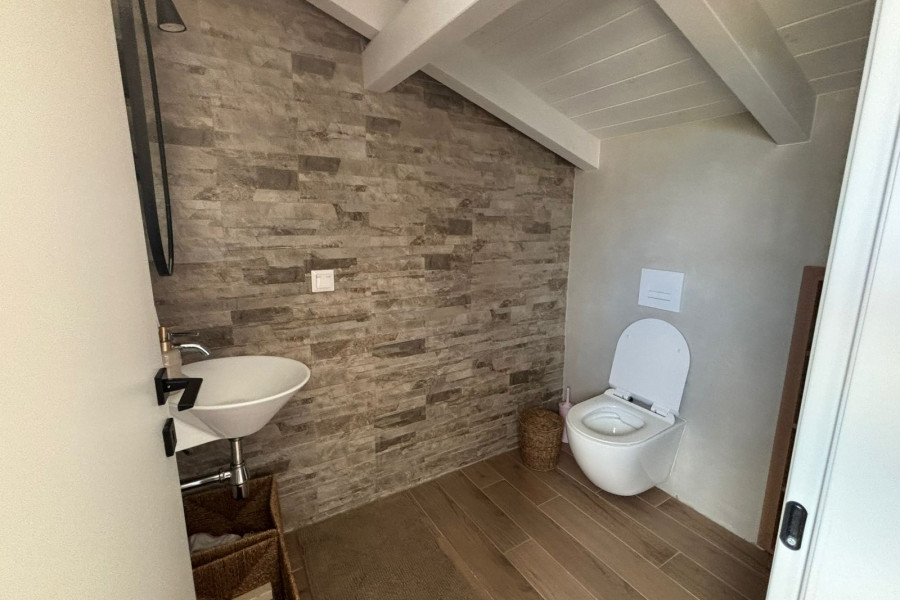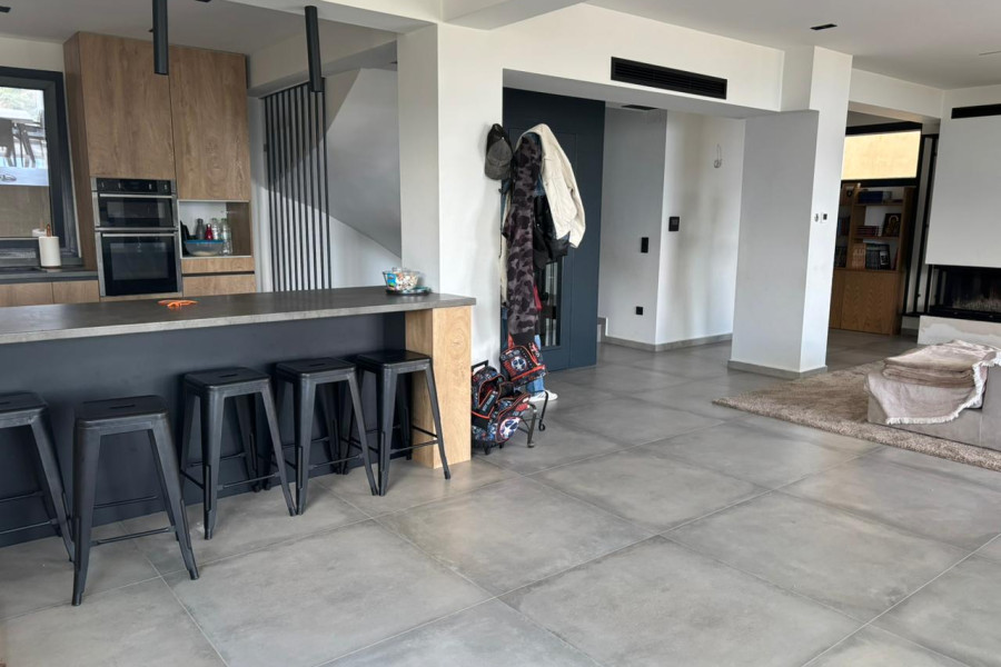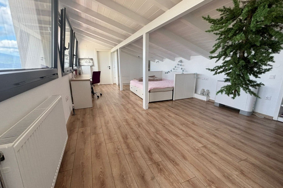 Upon entering the ground floor, there is a spacious living room with a fireplace, a kitchen, and a bathroom. An internal staircase leads to the upper floor, where there are three bedrooms, one of which includes a walk-in closet and two bathrooms. Through one of the bedrooms via an internal staircase we have access to the attic which includes an additional bedroom and a bathroom.