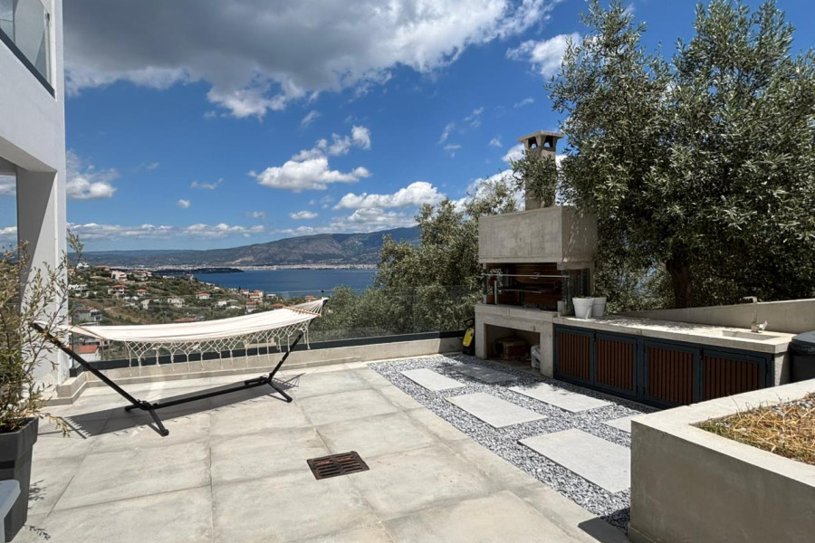 The property has amazing sea view from the ground floor, upper levels, and outdoor areas. It also includes a BBQ area and private parking space.