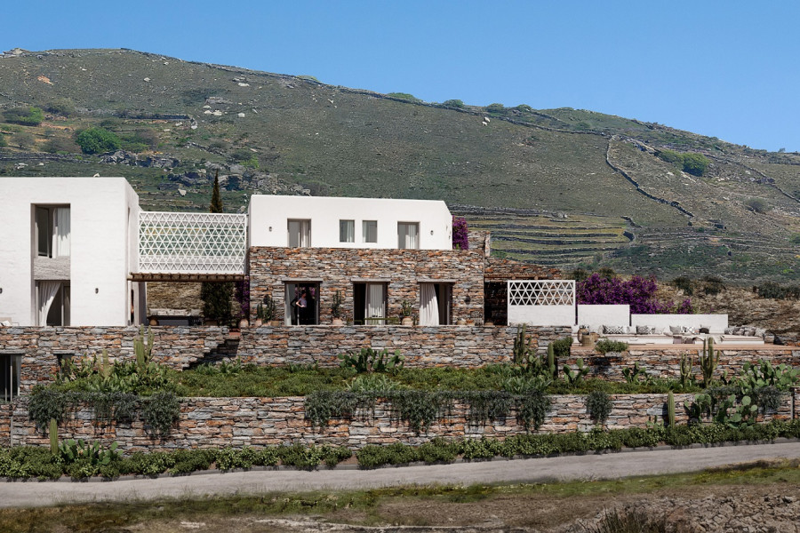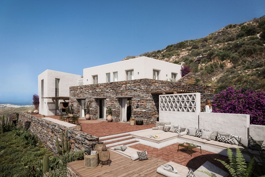 The property offers unobstructed vistas of the sea and the surrounding Cycladic landscape, just 9 km from the port of Tinos.