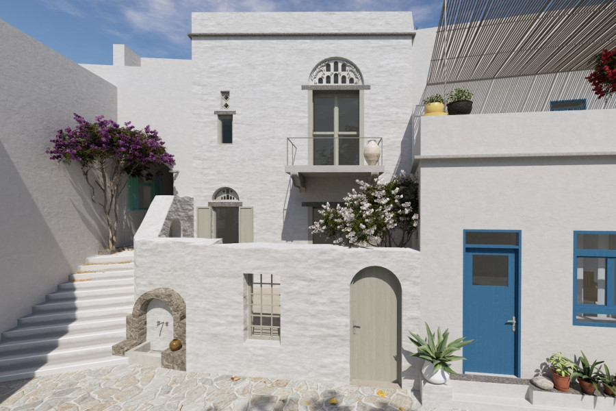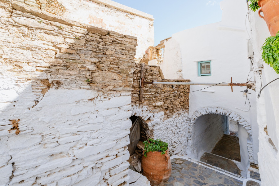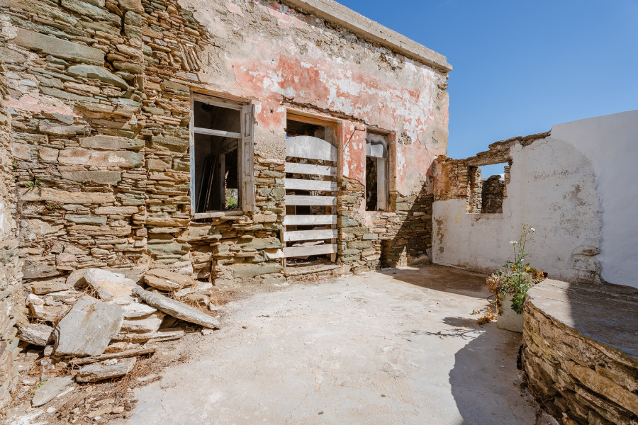 The plots have a total surface area of 196 sq.m., while the existing ruined buildings extend over 315 sq.m. The location offers unobstructed views of the Aegean landscape, and the property uniquely combines the authenticity of Cycladic architecture with the potential for impressive renovation.