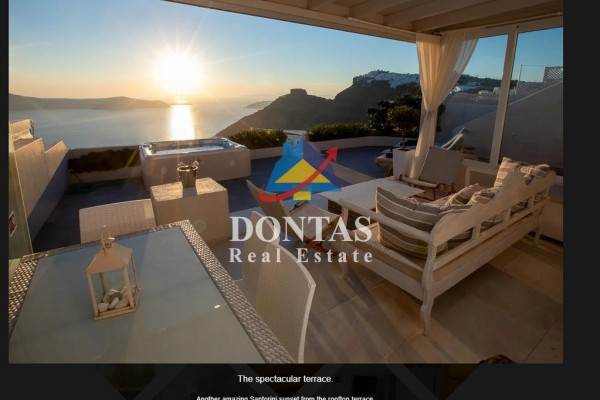 The property is surrounded by spacious terraces, seating areas with sea views, a well-maintained garden, and a swimming pool.