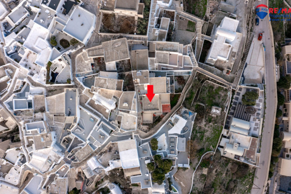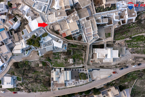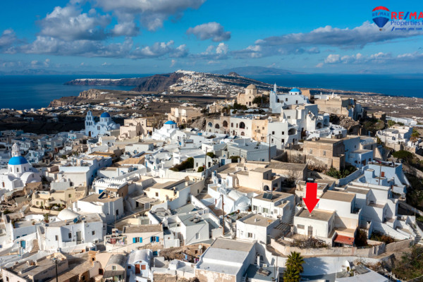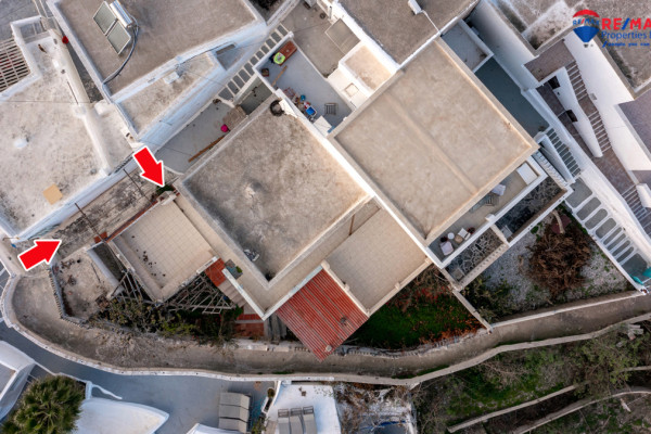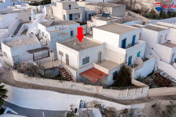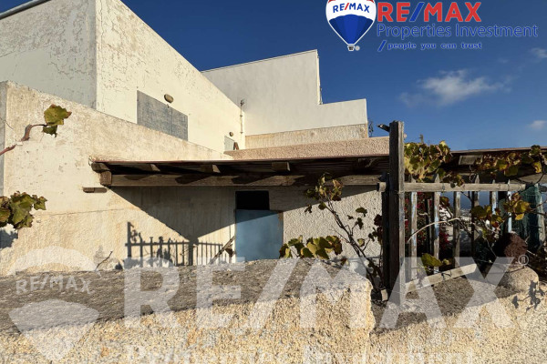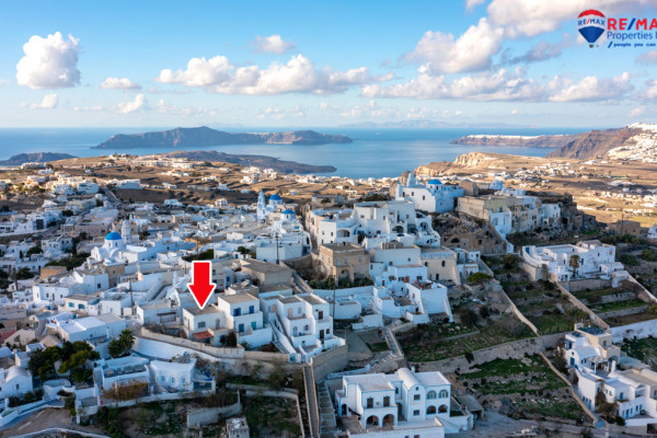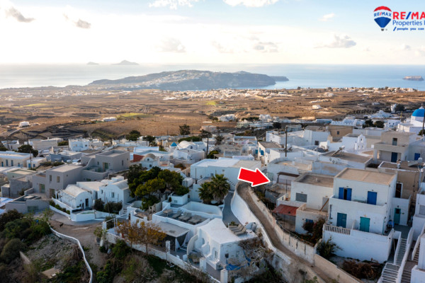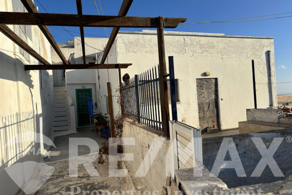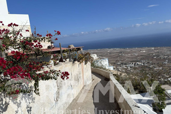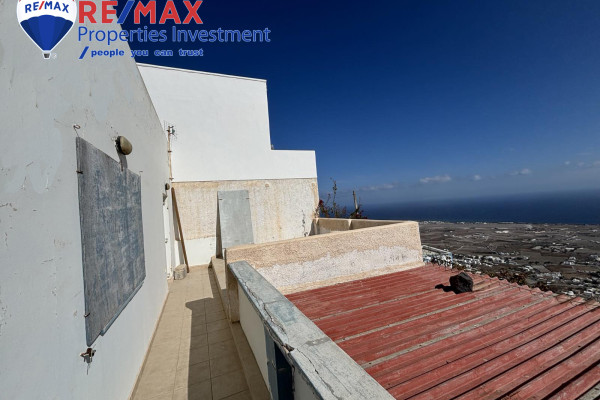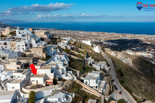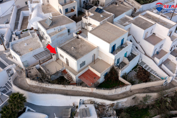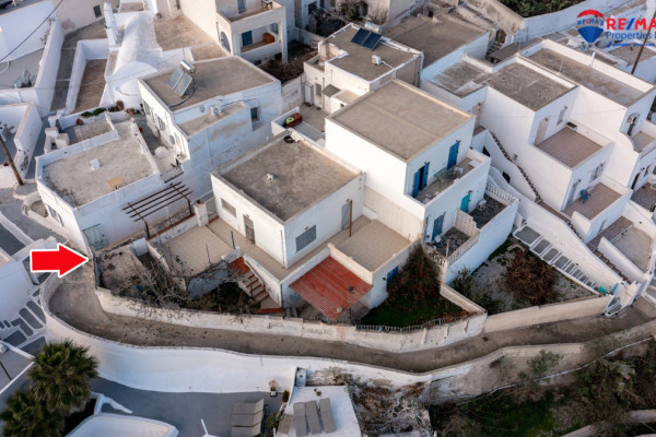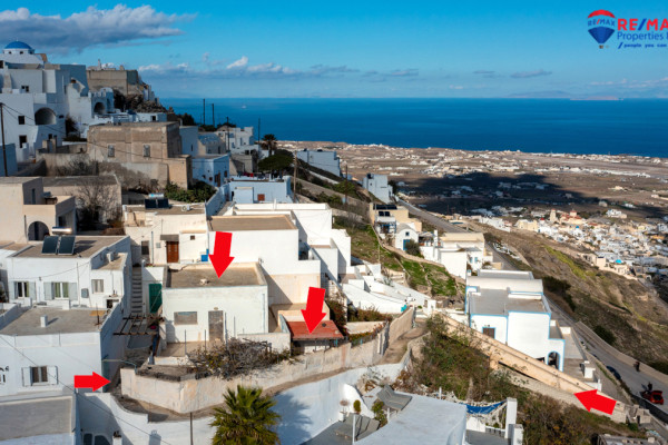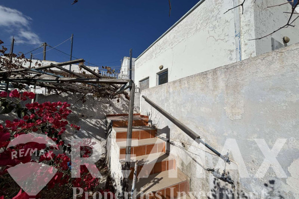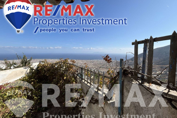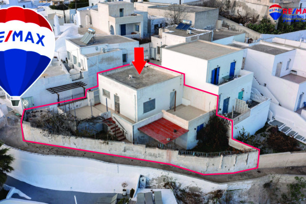Detached house for sale in Pyrgos Santorini, just a few meters from the enchanting Kasteli. The property, with a total area of 77.42 sq.m., is located within a plot of 189.68 sq.m. and has a courtyard and a terrace with a garden and a panoramic view towards Kamari, the airport and Anafi, with an eastern orientation that gives magnificent sunrises. The ground floor of 50.17 sq.m. includes hall, living room, kitchen, bedroom and bathroom, while in the basement of 27.25 sq.m. there is an additional bedroom with kitchen and bathroom, ideal for hosting or independent use. It also has a 10 sq.m. warehouse. The residence, with the right renovation, can be transformed into an excellent house with a view and feel of authentic Santorini, ideal for both private use and tourist exploitation - ID 1271629 - Price €230,000. - RE/MAX Properties Investment Santorini - Tel. 22860 24504 – email: