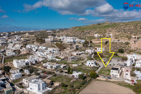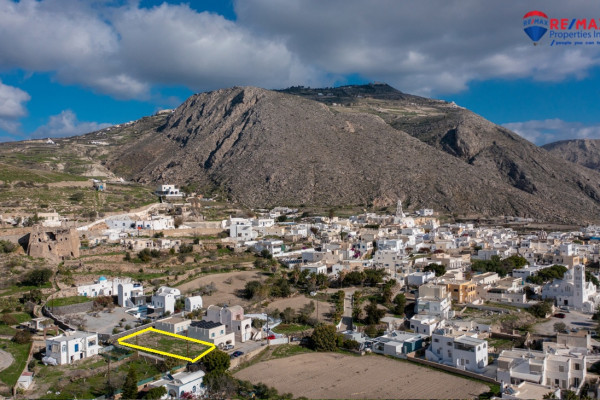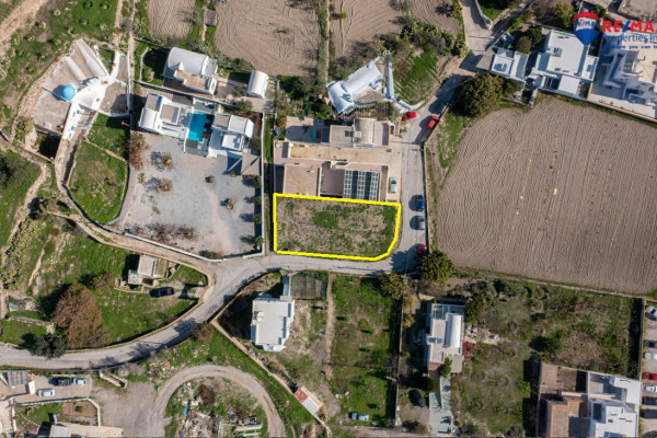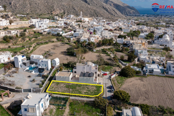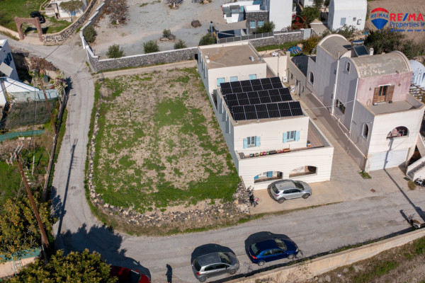 An even and buildable corner plot for sale in Emporio Santorini, with building rights of 152.28 sq.m. including basements. The property has an unobstructed sea view and a southern orientation, offering plenty of light and ideal living conditions.