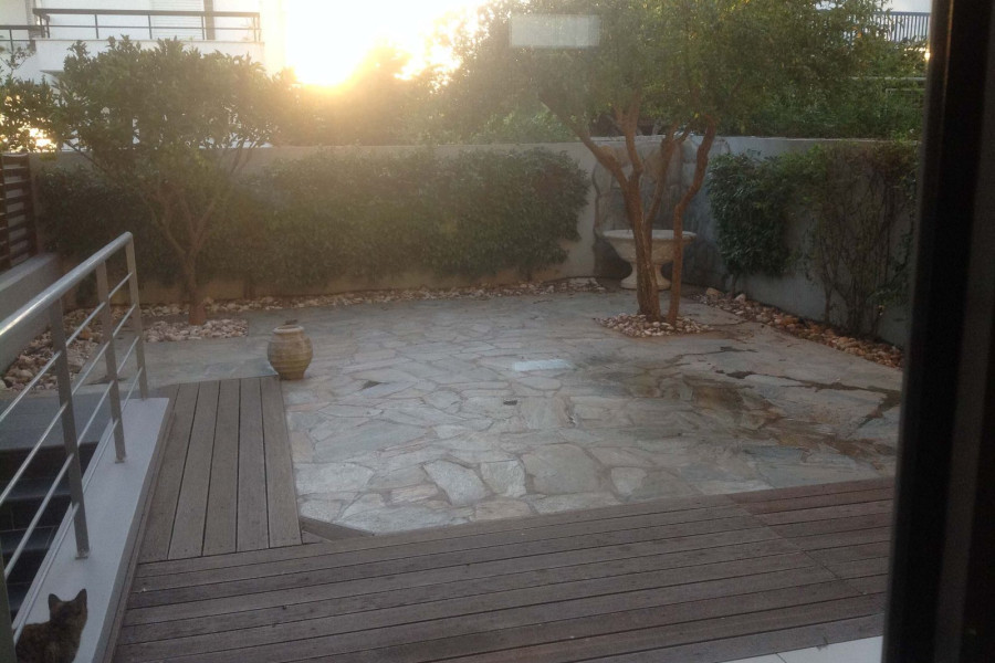 Back terrace with fruit trees, front terrace, garden and outdoor stone shower