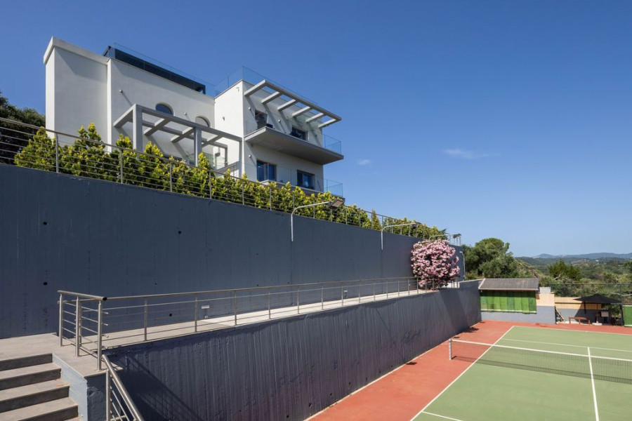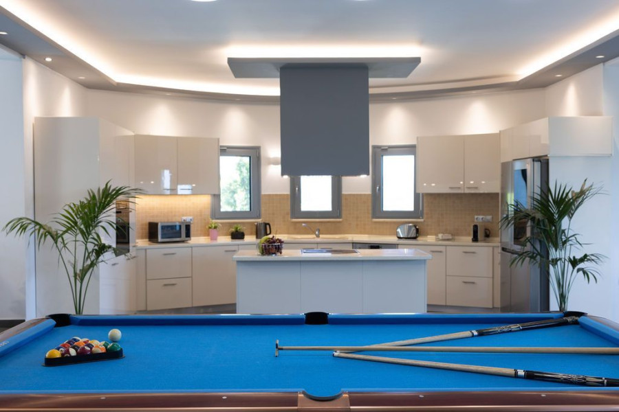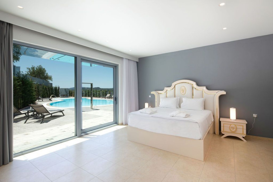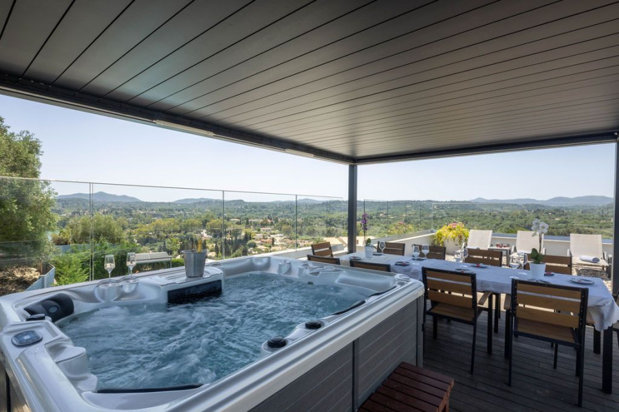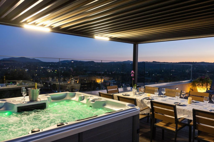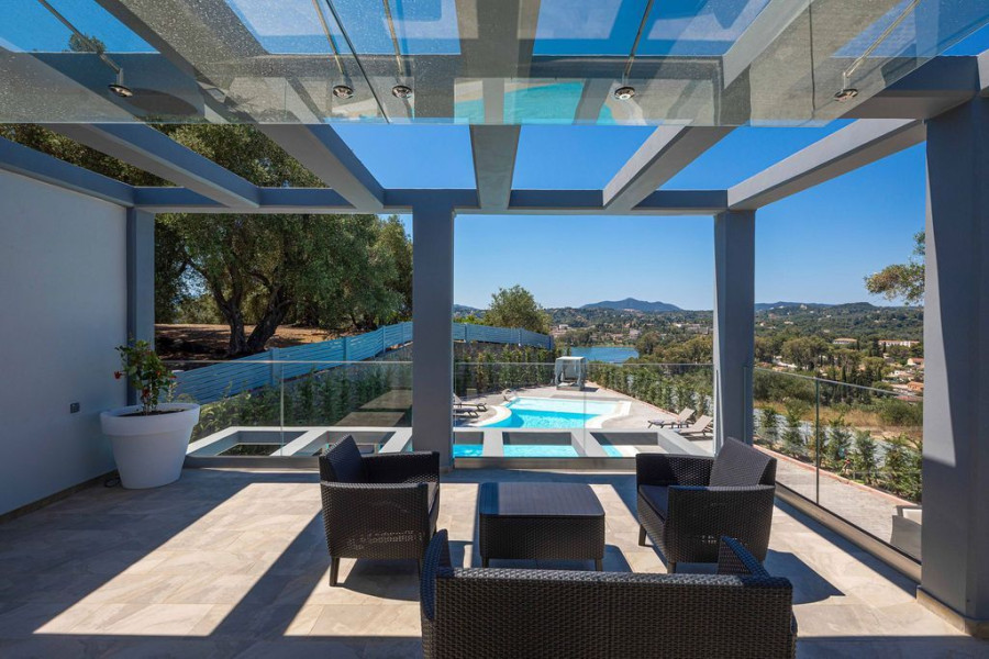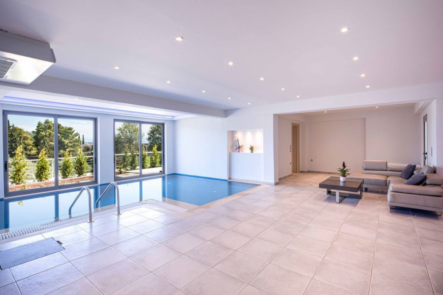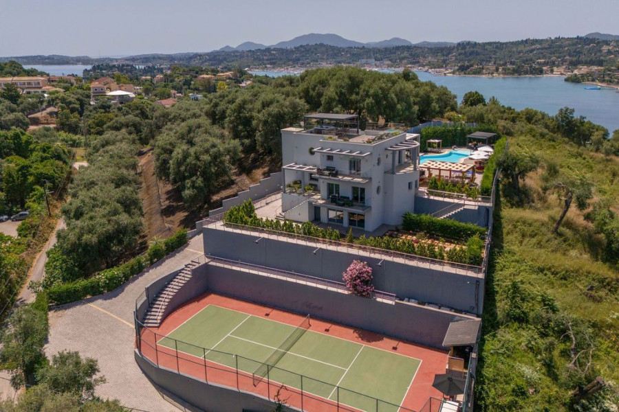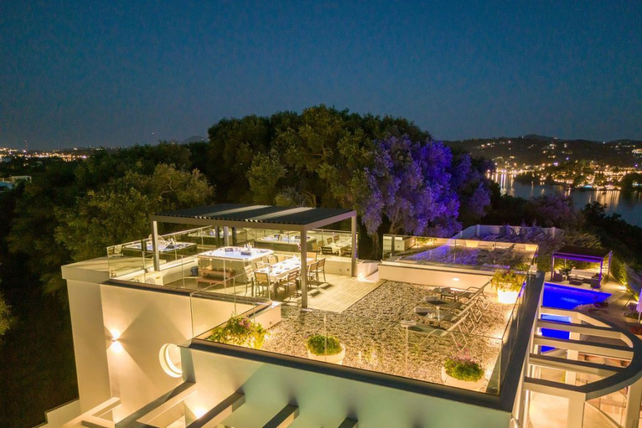 The Villa is fully furnished and is located in one of the most beautiful and unparalleled areas of Corfu, with fantastic views of the sea and the Marina of the area, on a hill that provides the necessary view and privacy that the property owner needs.The villa has an outdoor and indoor swimming pool. It also consists of:Basement which during its legalization was considered a ground floor of 141.52 sq.m. with an indoor swimming pool of 23.67 sq.m. heated with hydromassage, garage, heat pump system, solar heated water, solar systems to cover part of the lighting, automated system with power outagefrom the PPC to put into operation a diesel generator, gym area, bathroom, engine room tanks, wardrobe room, cloakroom, guest room, staff room with bathroom and finally a ground floor elevator.The villa has 3 different levels with 6 bedrooms, 7 bathrooms, plenty of outdoor space and a roof garden.1st floorIt consists of a living room with billiards, kitchen, dining room, large TV with 3D electronic fireplace, room with en-suite bathroom, main entrance and floor elevator.2nd Floor:It consists of a room with wooden parquet flooring, wooden ceiling with internal bathroom, Master room with internal bathroom and internal wardrobe, verandas on three sides and 2nd Floor Elevator.In the outdoor area.The roof garden is a luxurious fully furnished terrace with a jacuzzi, dining area for up to 10 and sun loungers.