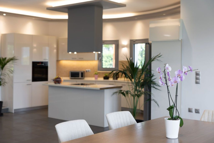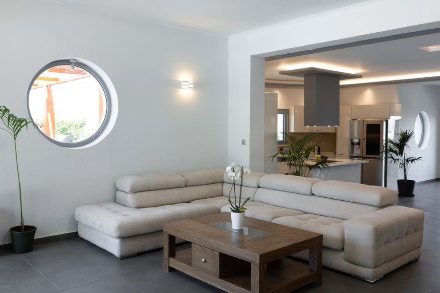 CORFU AREA KOMMENO For sale is a luxurious villa of unique architectural beauty, 450 sq m, 3 levels, on a plot of 2,007.63 sq m in the area of Kommeno