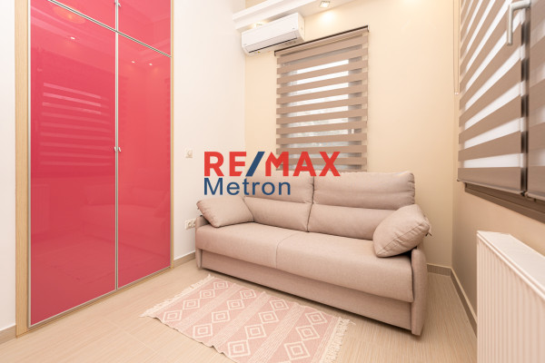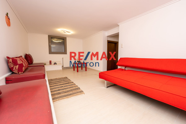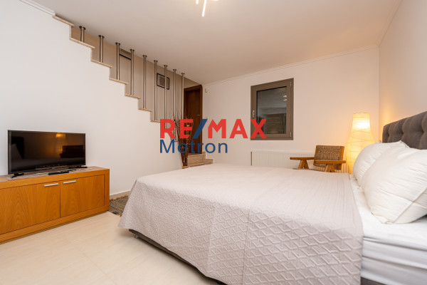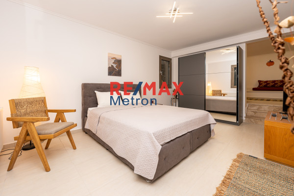 On the upper level are three bedrooms and a bathroom, all designed with luxury and functionality. These bedrooms have a large, wide and comfortable balcony with a stunning view of the sea and Glarokavos, offering a sense of tranquility and luxury every day. On the lower level there is an additional bedroom with WC, a small storage area and a playroom, ideal for children or for entertainment.