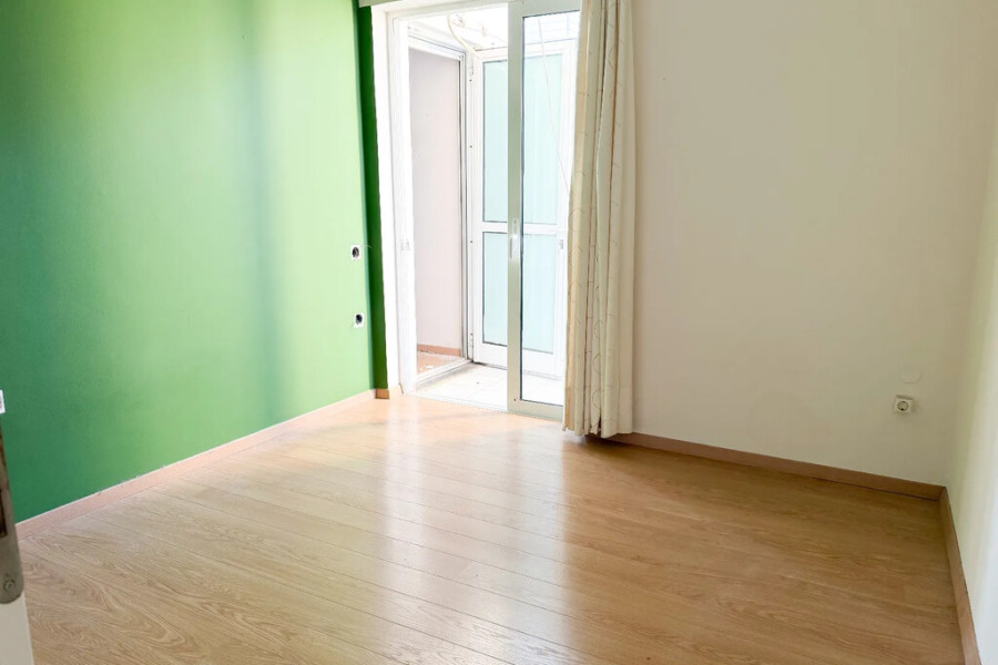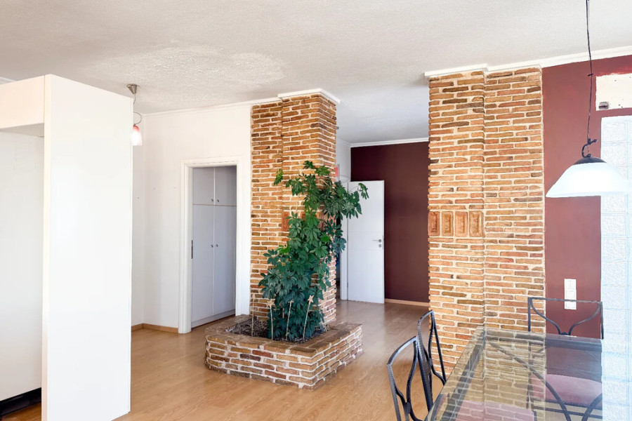 The property consists of two bedrooms and a spacious open-plan living room and kitchen, with the easy possibility of creating a third bedroom, as provision already exists in the layout. The enclosed semi-outdoor area can be reopened to its original configuration, should the new owner wish so.