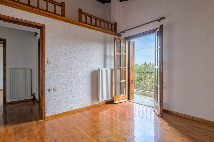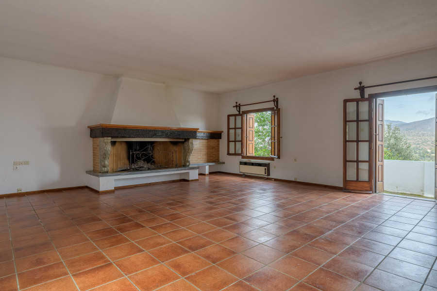 The main level comprises an entrance hall, a comfortable and airy living/dining area with a large fireplace, a kitchen, W.C., and storage space.