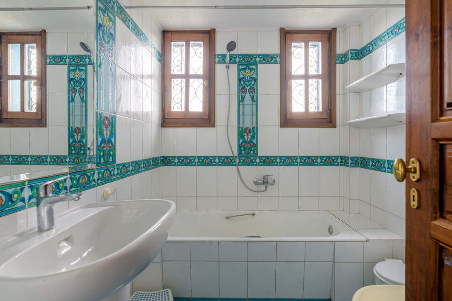 The green outdoor area is surrounded by a beautiful garden with a shaded veranda, BBQ, and wood-fired oven. In addition, the property offers 1 parking space and 3 storage rooms with a total area of 50sq.m.