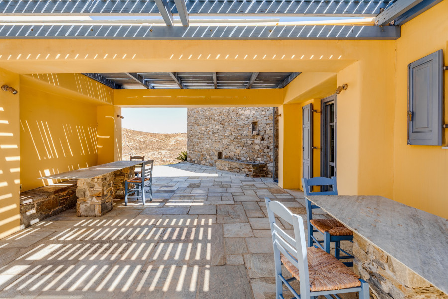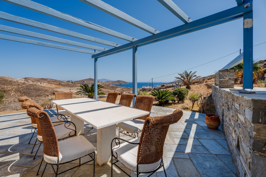 The property includes terraces with seating areas and a large garden offering exceptional views of the sea and the Cycladic landscape.