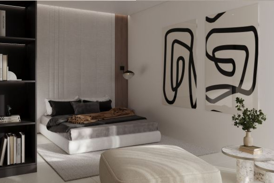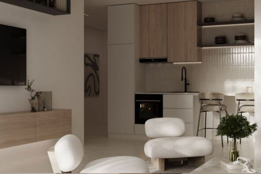 Neutral, calming color tonesAbundant natural lightSleek, modern furnitureLight wood partitionsMarble detailsSoft, high-quality textilesThe result is a bright, clean, and airy living space that feels both luxurious and welcoming — ideal for contemporary city living.