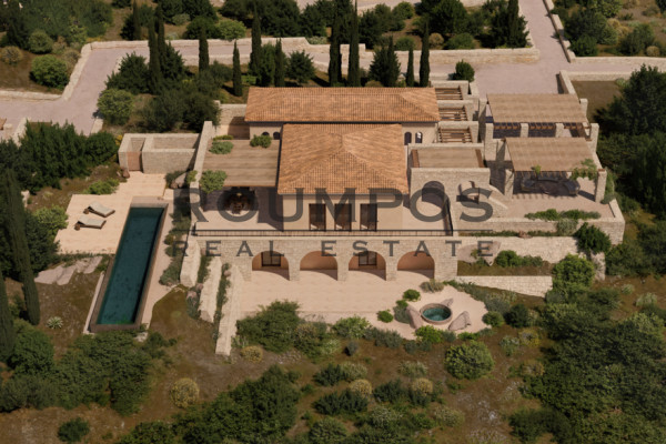 The outdoor areas have been designed with special attention to detail and comfort. They have a private pool and outdoor seating and dining areas shaded by wooden pergolas. The large, paved terraces, covered with natural materials, are framed by an unobstructed view of the Ionian Sea, offering an ideal setting for relaxation and hospitality.