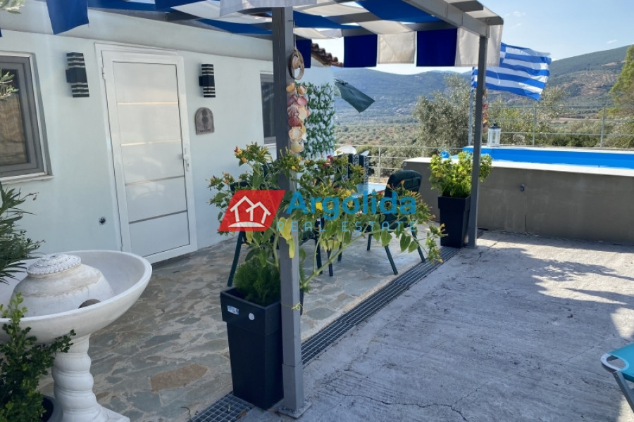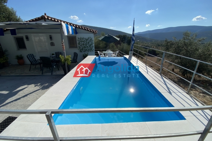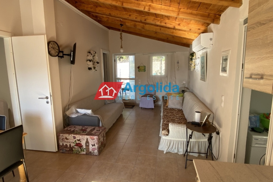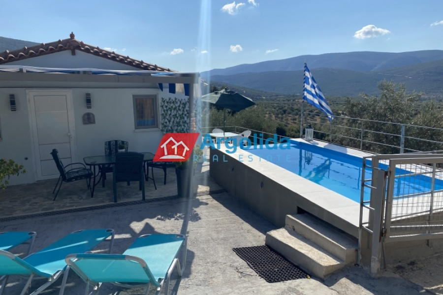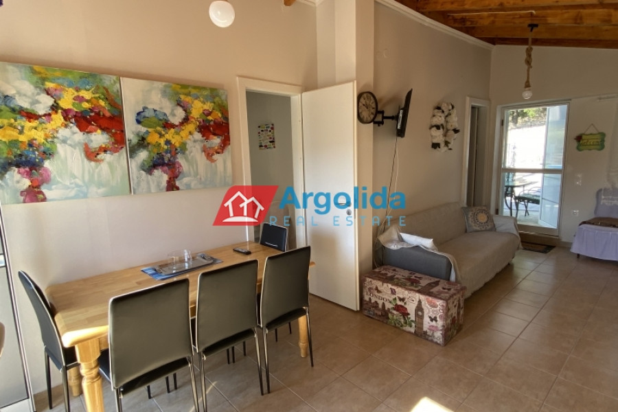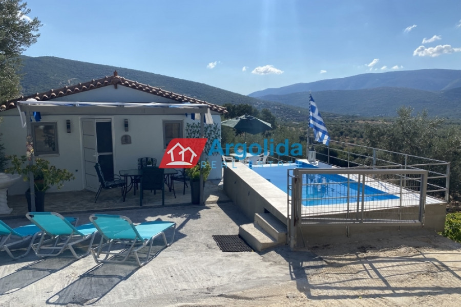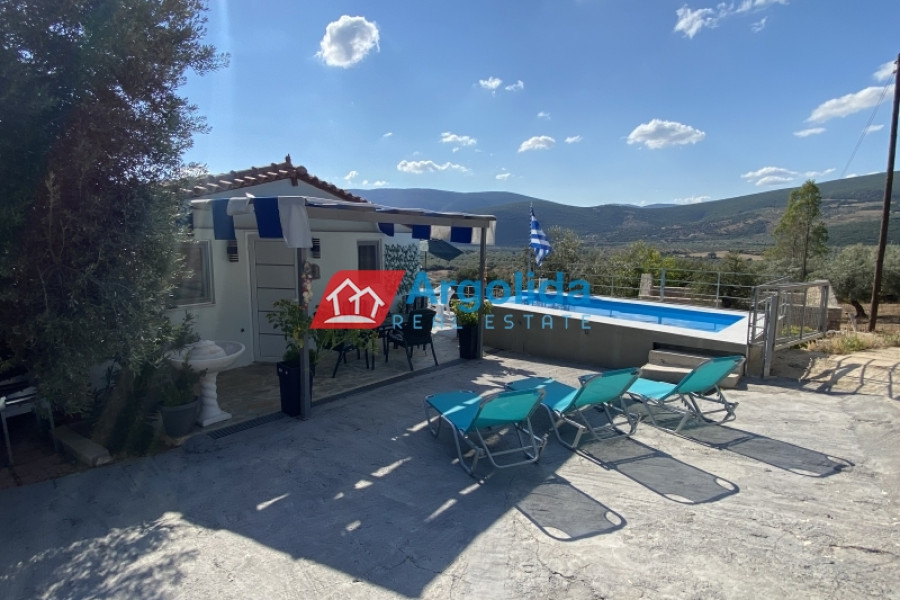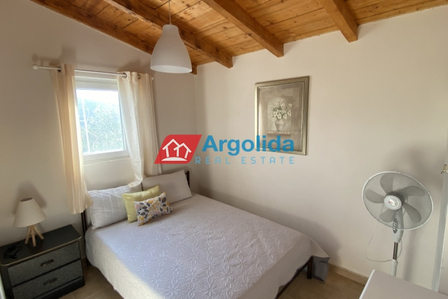 In Agrilitsa, a small rural settlement located 20 minutes from the town of Argos, a fully furnished ground-floor house of 60 sq.m. is available for rent within a 100 sq.m. plot featuring a private pool. The residence offers an open-plan living and dining area with a kitchen, two bedrooms, and one bathroom. The living room provides direct access to a veranda with beautiful views, while the outdoor space includes a lovely landscaped garden with a pool. This charming home is an ideal choice for anyone seeking a quiet, secluded, and relaxing lifestyle close to nature.